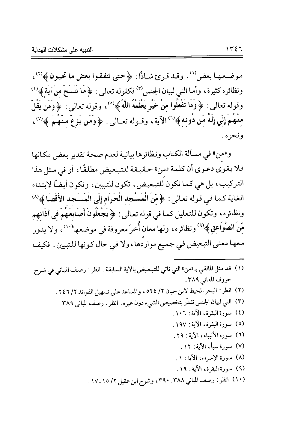 موضعها بعض، وقد قرئ شاذًا: {حتى تنفقوا بعض ما تحبون}، ونظائرهم كثيرة، وأما التي لبيان الجنس فكقوله تعالي: {ما ننسخ من آية} ووله تعالي: {وما تفعلوا من خير يعلمه الله}، وقوله تعالي: {ومن يل منهم إني إله من دونه} الآية، وقوله تعالي: {ومن يزغ منهم}، ونحوه.
