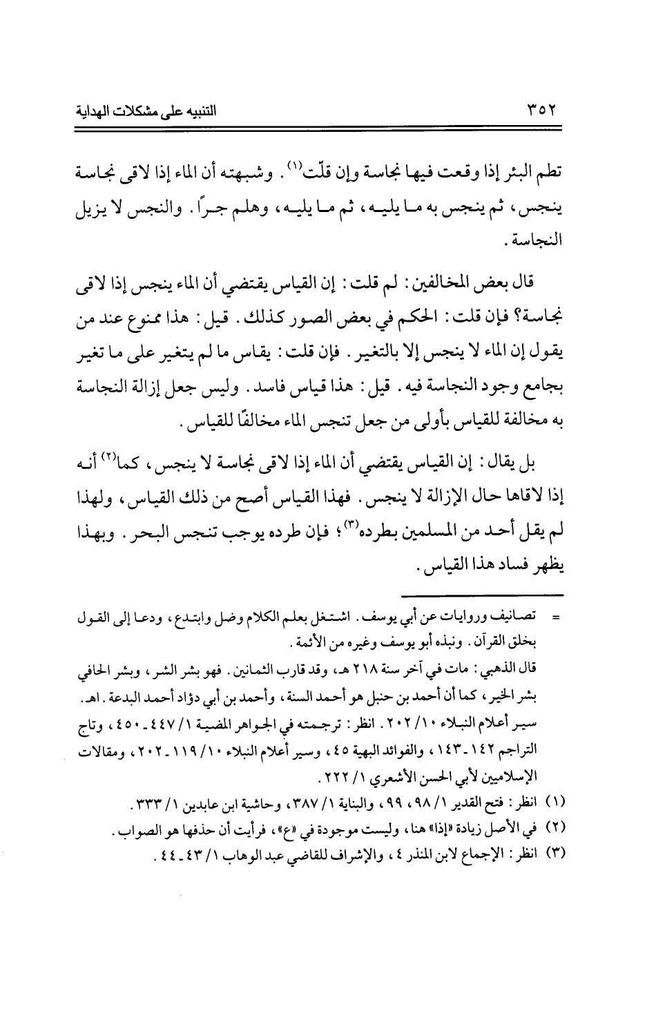 قال بعض المخالفين: لم قلت: إن القياس يقتضي أن الماء ينجس إذا لاقى نجاسة؟ فإن قلت: الحكم في بعض الصور كذلك. قيل: هذا ممنوع عند من يقول إن الماء لا ينجس إلا بالتغير. فإن قلت: يقاس مالم يتغير على ما تغير بجامع وجود النجاسة فيه. قيل: هذا قياس فاسد. وليس جعل إزالة النجاسة به مخالفة للقياس بأولى من جعل تنجس الماء مخالفًا للقياس.
