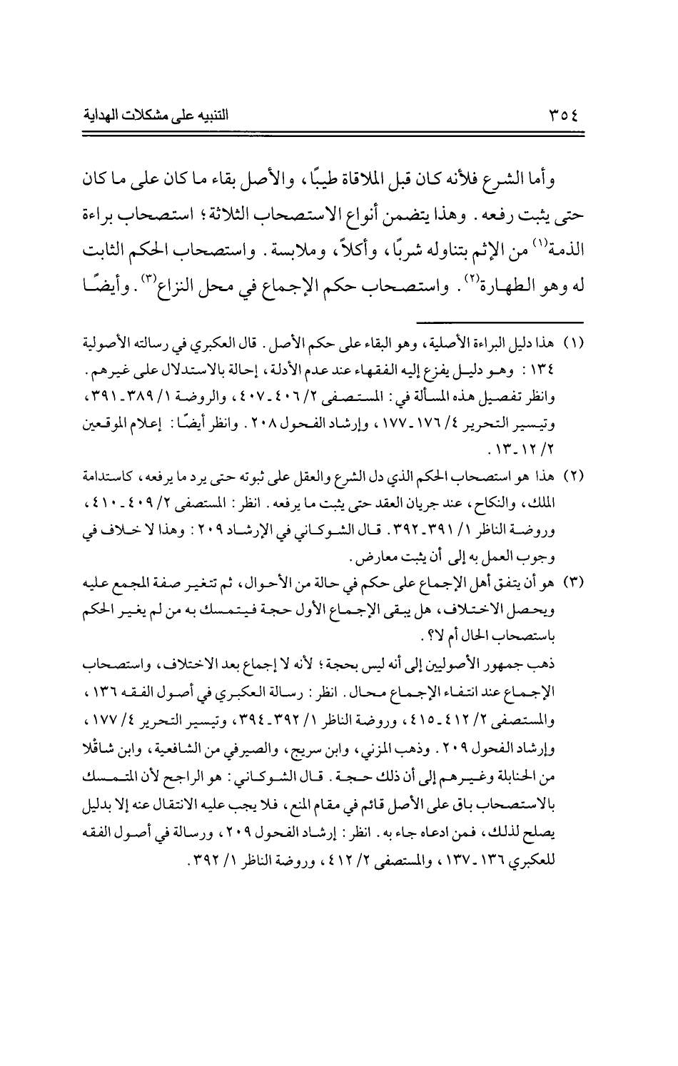 وأما الشرع فلأنه كان قبل الملاقاة طيبًا، والأصل بقاء ما كان على ما كان حتى يثبت رفعه. وهذا يتضمن أنواع الاستصحاب الثلاثة؛ استصحاب براءة الذمة من الإثم بتناوله شربًا، وأكلًا، وملابسة. واستصحاب الحكم الثابت له وهو الطهارة. واستصحاب حكم الإجماع في محل النزاع. وأيضًا