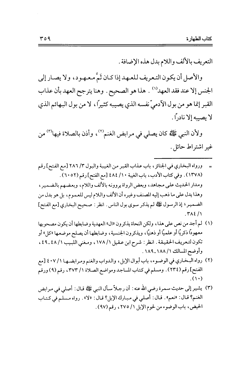 والأصل أن يكون التعريف للعهد إذا كان ثم معهود، ولا يصار إلى الجنس إلا عند فقد العهد. هذا هو الصحيح. وهنا يترجح العهد بأن عذاب القبر إنما هو من بول الآدمي نفسه الذي يصيبه كثيرًا، لا من بول البهائم الذي لا يصيبه إلا نادرًا.