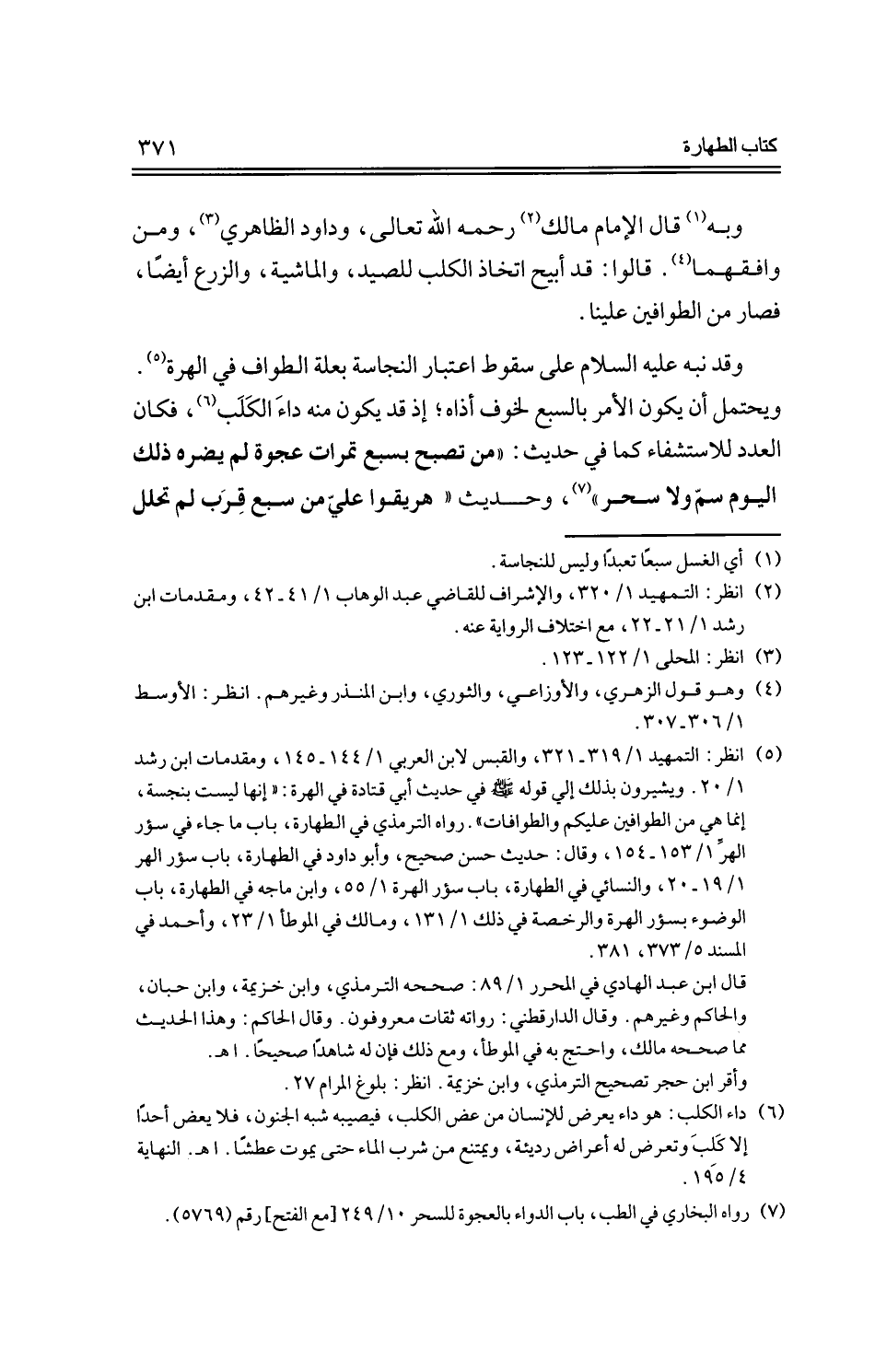 وقد نبه عليه السلام على سقوط اعتبار النجاسة بعلة الطواف في الهرة. ويحتمل أن يكون الأمر بالسبع لخوف أذاه؛ إذ قد يكون منه داء الكلب، فكان العدد للاستشفاء كما في حديث: "من تصبح بسبع تمرات عجوة لم يضره ذلك اليوم سم ولا سحر"، وحديث "هريقوا علي من سبع قرب لم تحلل