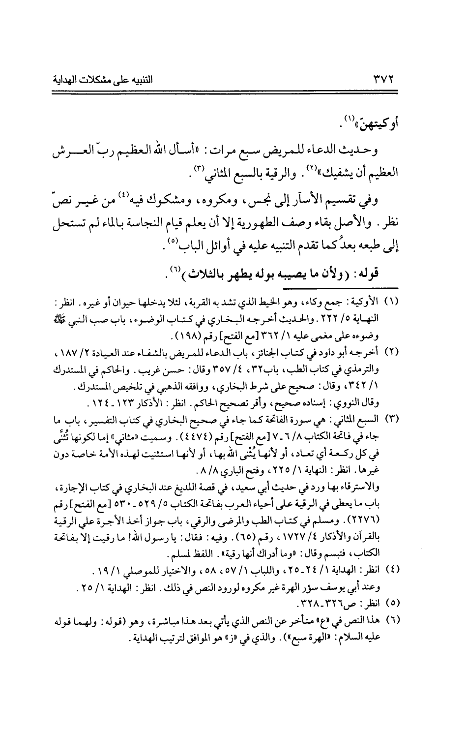 وحديث الدعاء للمريض سبع مرات: "أسأل الله العظيم رب العرش العظيم أن يشفيك". والرقية بالسبع المثاني.