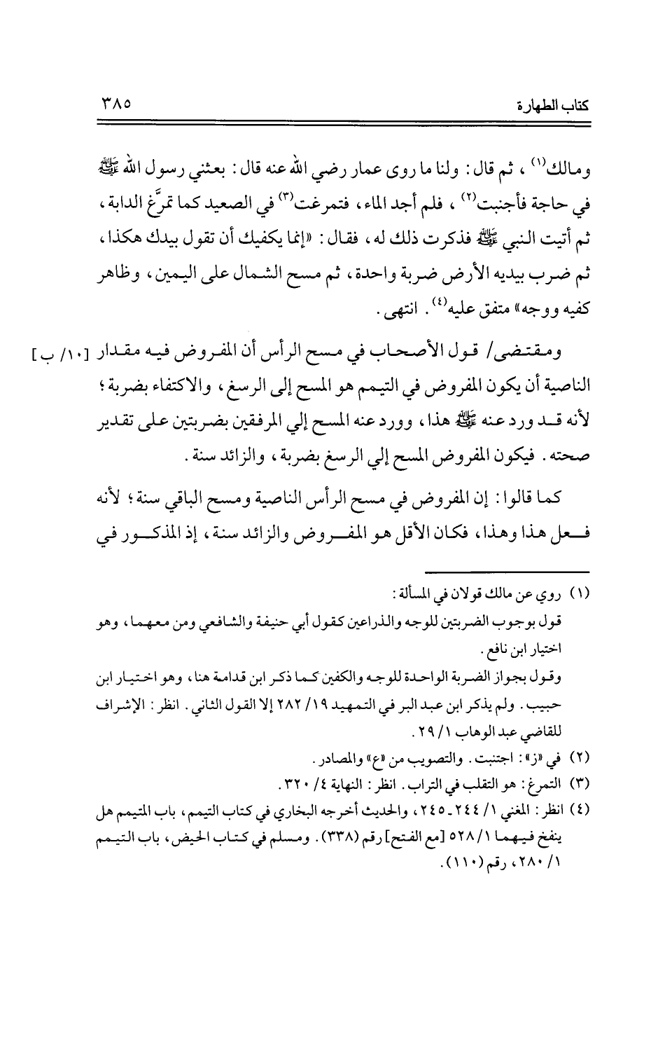 ومالك، ثم قال: ولنا ما روى عمار -رضي الله عنه- قال: بعثني رسول الله -صلى الله عليه وسلم- في حاجة فأجنبت، فلم أجد الماء، فتمرغت في الصعيد كما تمرغ الدابة، ثم أتيت النبي -صلى الله عليه وسلم- فذكرت ذلك له، فقال: "إنما يكفيك أن تقول بيدك هكذا، ثم ضرب بيديه الأرض ضربة واحدة، ثم مسح الشمال على اليمين، وظاهر كفيه ووجه" متفق عليه. انتهى.