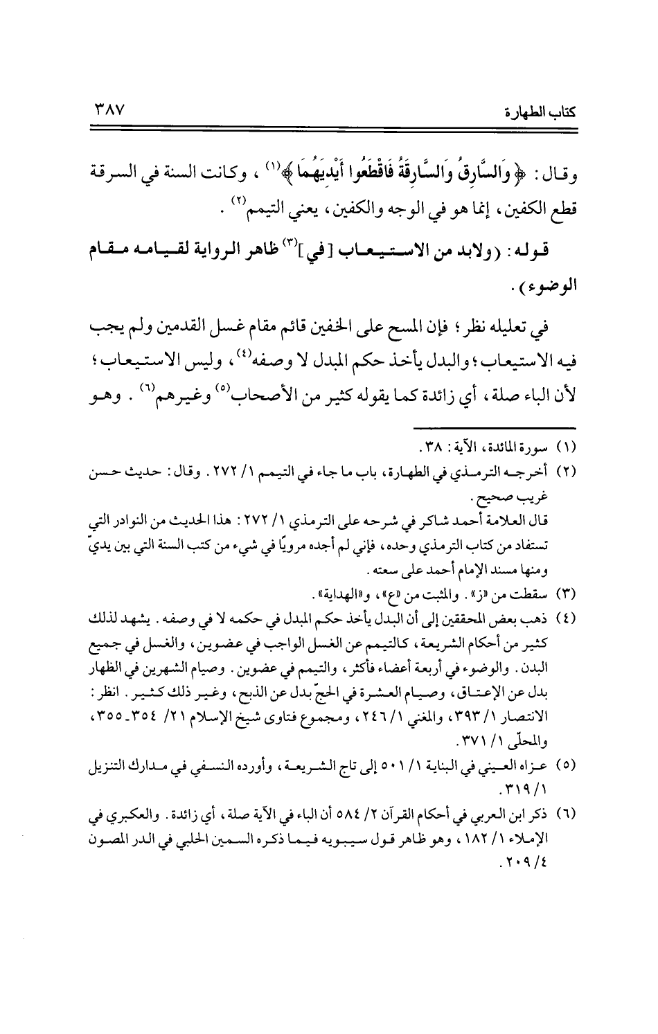 في تعليله نظر؛ فإن المسح على الخفين قائم مقام غسل القدمين ولم يجب فيه الاستيعاب؛ والبدل يأخذ حكم المبدل لا وصفه، وليس الاستيعاب؛ لأن الباء صلة، أي زائدة كما يقوله كثير من الأصحاب وغيرهم. وهو