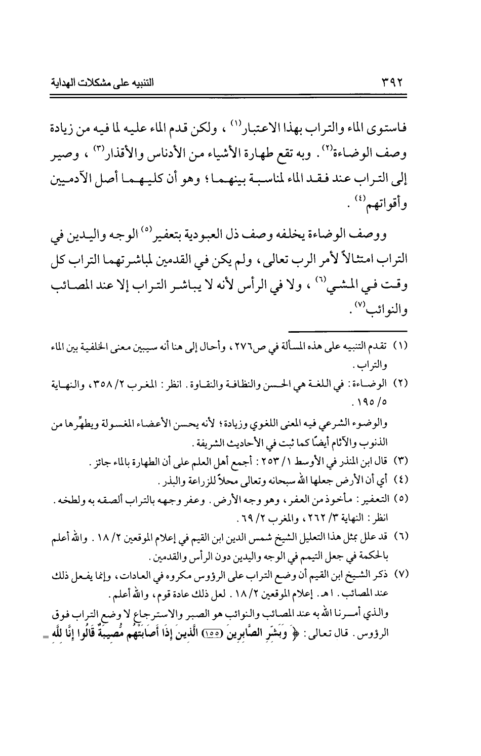 ووصف الوضاءة يخلفه وصف ذل العبودية بتعفير الوجه واليدين في التراب امتثالًا لأمر الرب تعالى، ولم يكن في القدمين لمباشرتهما التراب كل وقت في المشي، ولا في الرأس لأنه لا يباشر التراب إلا عند المصائب والنوائب.