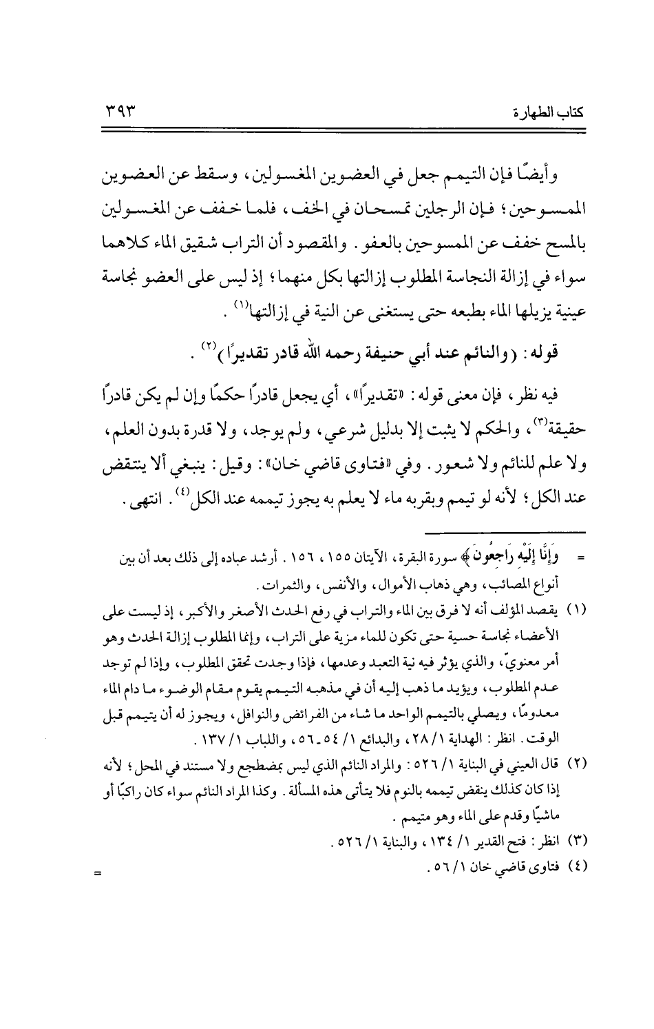 فيه نظر، فإن معنى قوله: "تقديرًا"، أي يجعل قادرًا حكمًا وإن لم يكن قادرًا حقيقة، والحكم لا يثبت إلا بدليل شرعي، ولم يوجد، ولا قدرة بدون العلم، ولا علم للنائم ولا شعور. وفي "فتاوى قاضي خان": وقيل: ينبغي ألا ينتقض عند الكل؛ لأنه لو تيمم وبقربه ماء لا يعلم به يجوز تيممه عند الكل. انتهى.