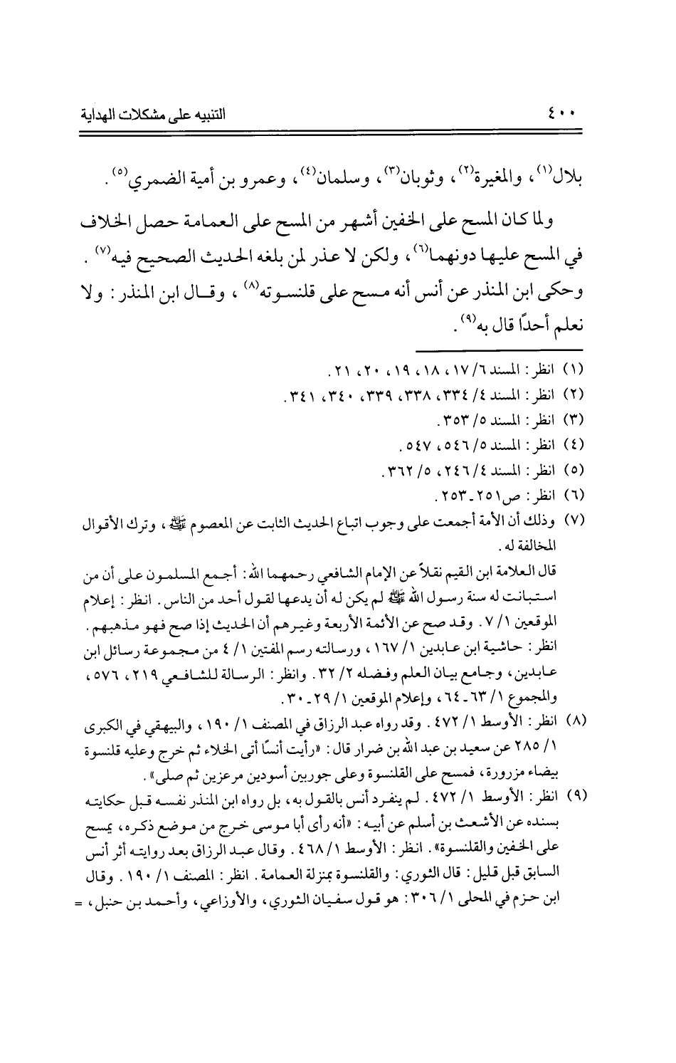 ولما كان المسح على الخفين أشهر من المسح على العمامة حصل الخلاف في المسح عليها دونهما، ولكن لا عذر لمن بلغه الحديث الصحيح فيه. وحكى ابن المنذر عن أنس أنه مسح على قلنسوته، وقال ابن المنذر: ولا نعلم أحدًا قال به.