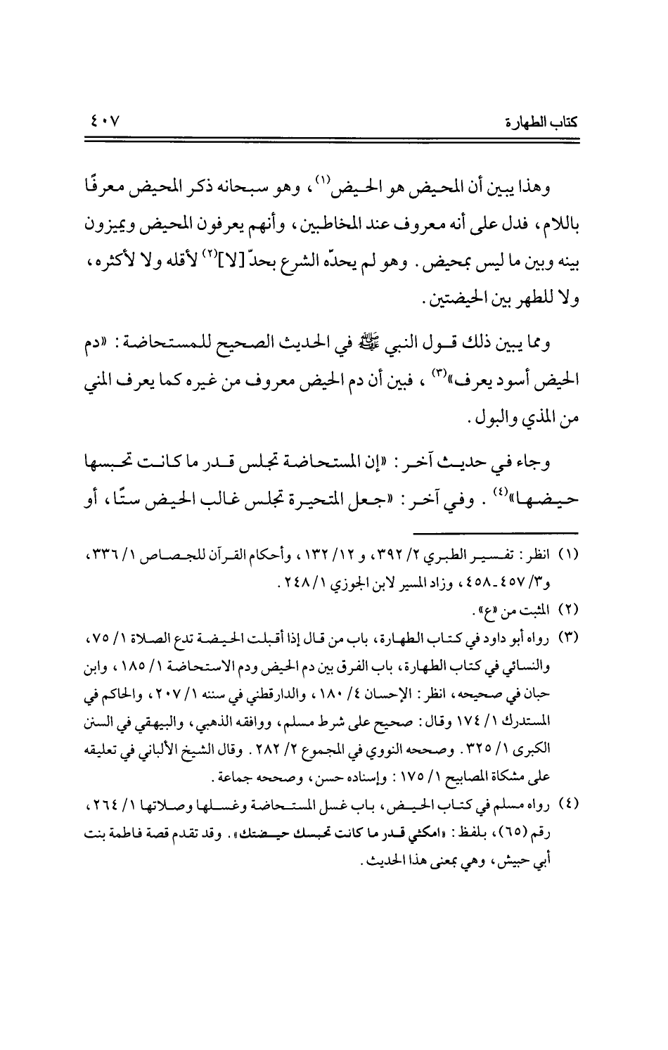 وهذا يبين أن المحيض هو الحيض، وهو سبحانه ذكر المحيض معرفًا باللام، فدل على أنه معروف عند المخاطبين، وأنهم يعرفون المحيض ويميزون بينه وبين ما ليس بمحيض. وهو لم يحده الشرع بحد [لا] لأقله ولا لأكثره، ولا للطهر بين الحيضتين.