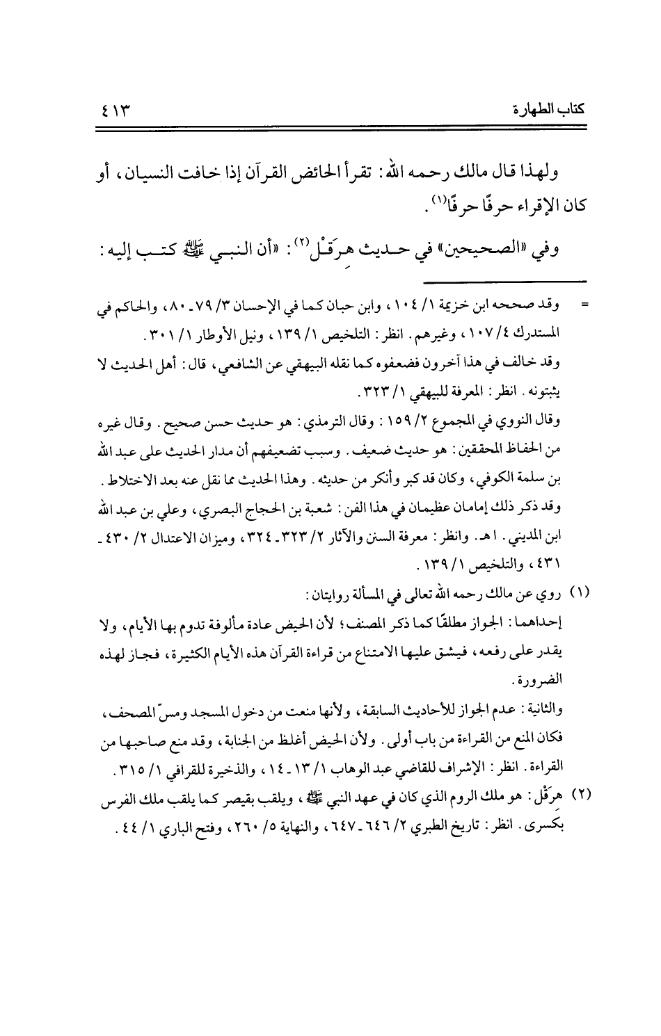 ولهذا قال مالك رحمه الله: تقرأ الحائض القرآن إذا خافت النسيان، أو كان الإقراء حرفًا حرفًا.