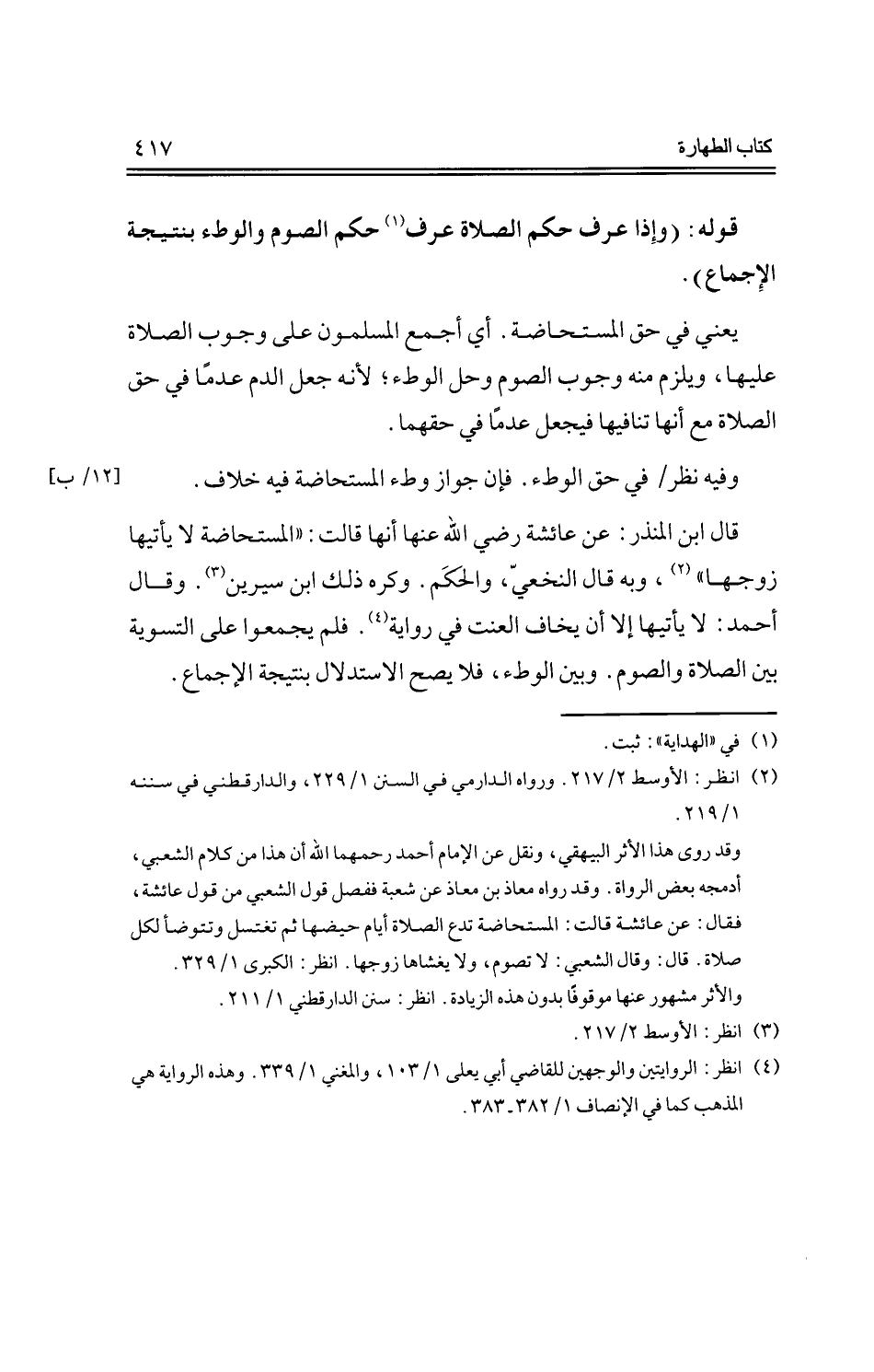 قال ابن المنذر: عن عائشة -رضي الله عنها- أنها قالت: "المستحاضة لا يأتيها زوجها"، وبه قال النخعي، والحكم. وكره ذلك ابن سيرين. وقال أحمد: لا يأتيها إلا أن يخاف العنت في رواية. فلم يجمعوا على التسوية بين الصلاة والصوم. وبين الوطء، فلا يصح الاستدلال بنتيجة الإجماع.