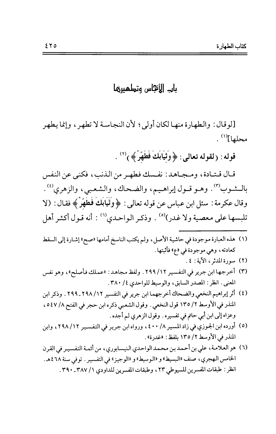 قوله: (لقوله تعالى: {وثيابك فطهر}).