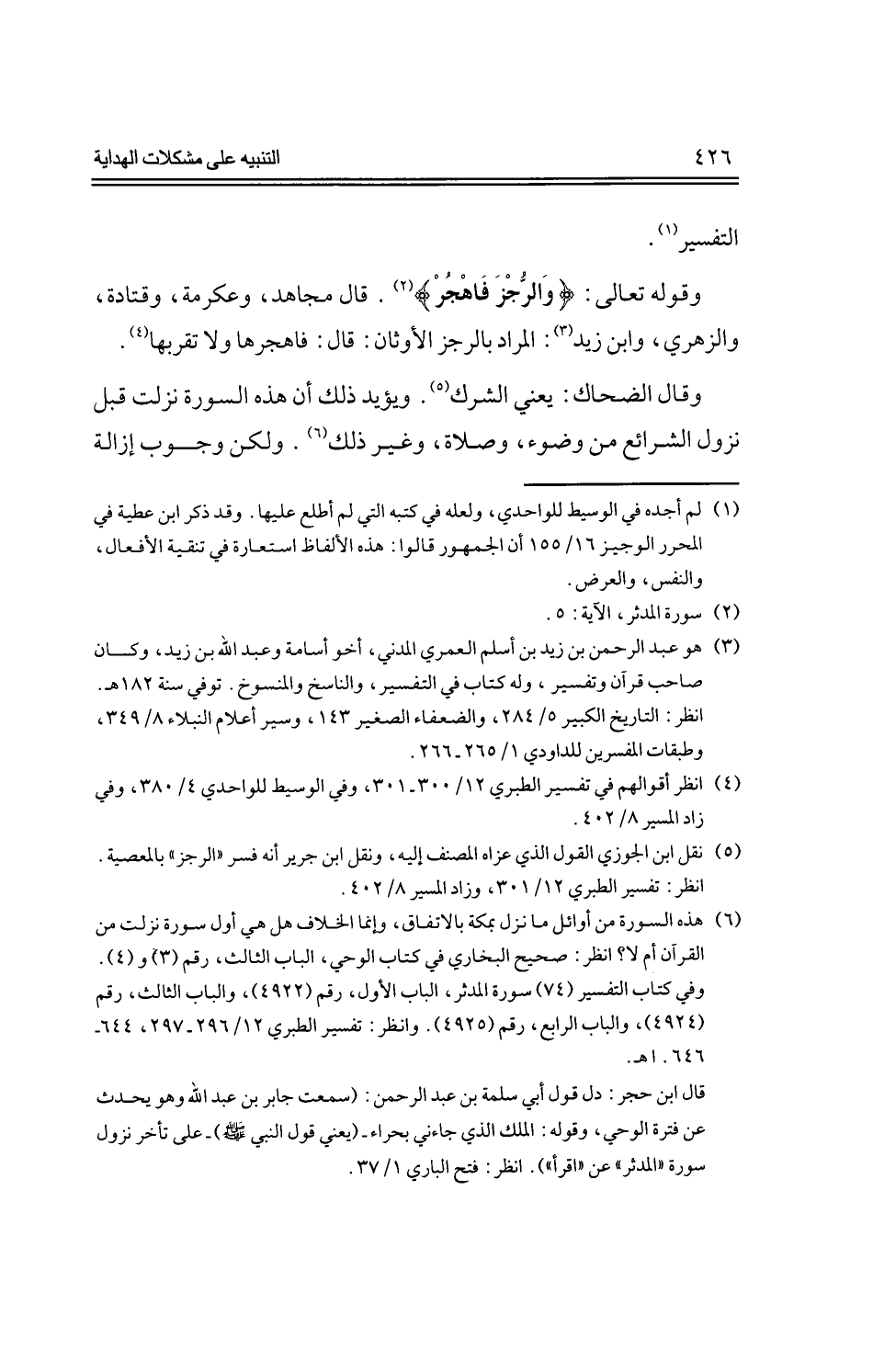 وقوله تعالى: {والرجز فاهجر}. قال مجاهد، وعكرمة، وقتادة، والزهري، وابن زيد: المراد بالرجز الأوثان: قال: فاهجرها ولا تقربها.