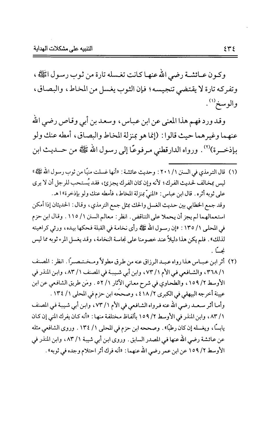 وقد ورد فهم هذا المعنى عن ابن عباس، وسعد بن أبي وقاص -رضي الله عنهما- وغيرهما حيث قالوا: (إنما هو بمنزلة المخاط والبصاق، أمطه عنك ولو بإذخرة). ورواه الدارقطني مرفوعًا إلى رسول الله -صلى الله عليه وسلم- من حديث ابن