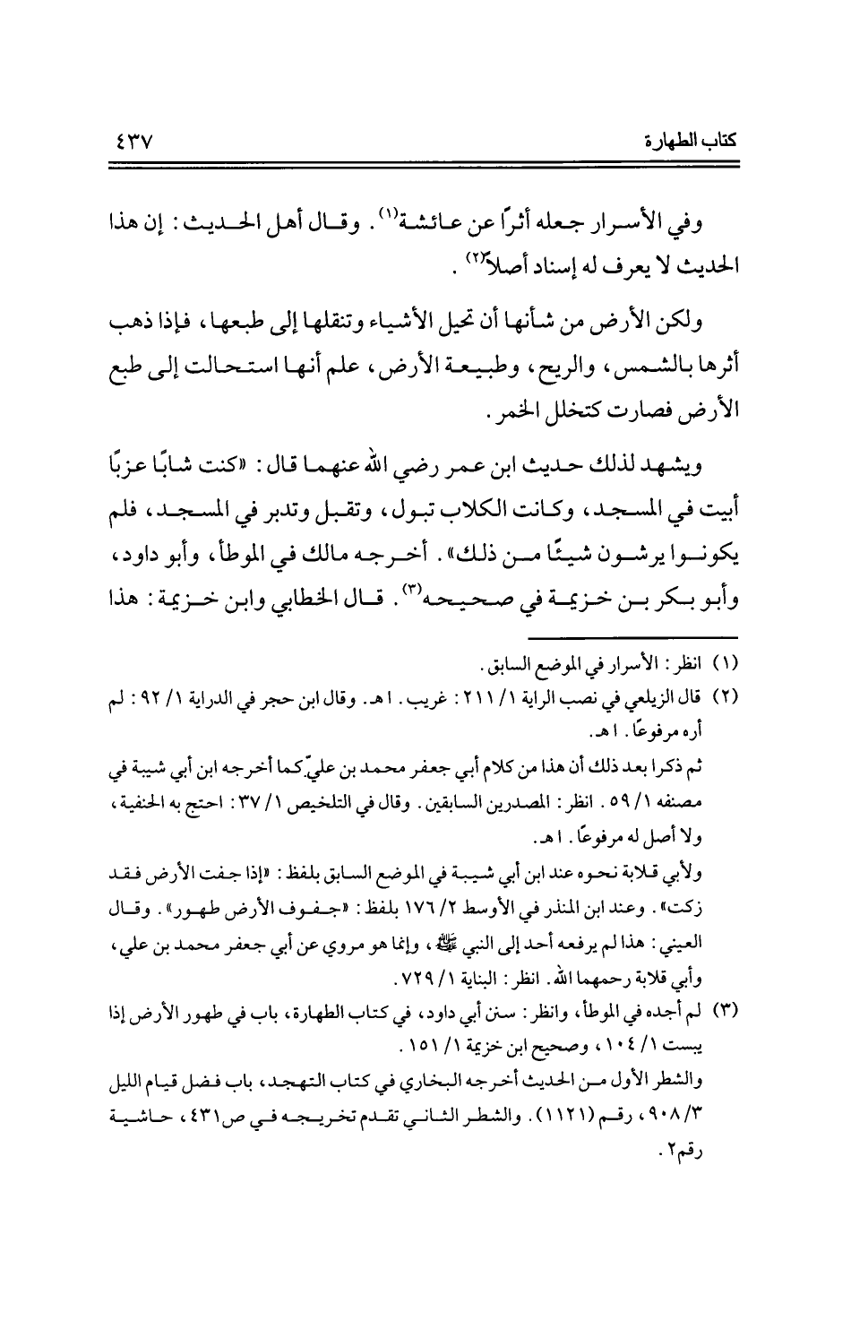ويشهد لذلك حديث ابن عمر -رضي الله عنهما- قال: "كنت شابًا عزبًا أبيت في المسجد، وكانت الكلاب تبول، وتقبل وتدبر في المسجد، فلم يكونوا يرشون شيئًا من ذلك". أخرجه مالك في الموطأ، وأبو داود، وأبو بكر بن خزيمة في صحيحه. قال الخطابي وابن خزيمة: هذا
