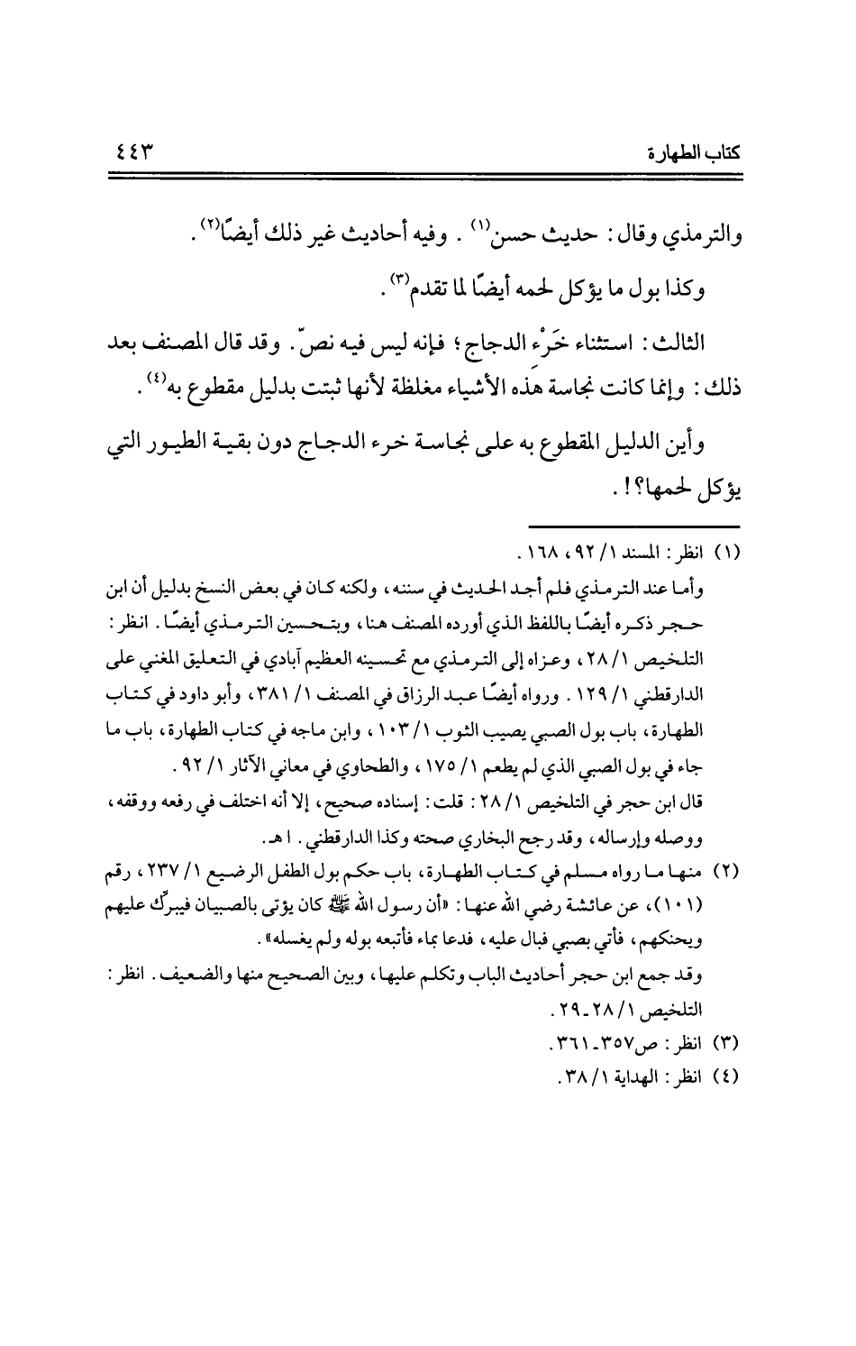 الثالث: استثناء خرء الدجاج؛ فإنه ليس فيه نص. وقد قال المصنف بعد ذلك: وإنما كانت نجاسة هذه الأشياء مغلظة لأنها ثبتت بدليل مقطوع به.