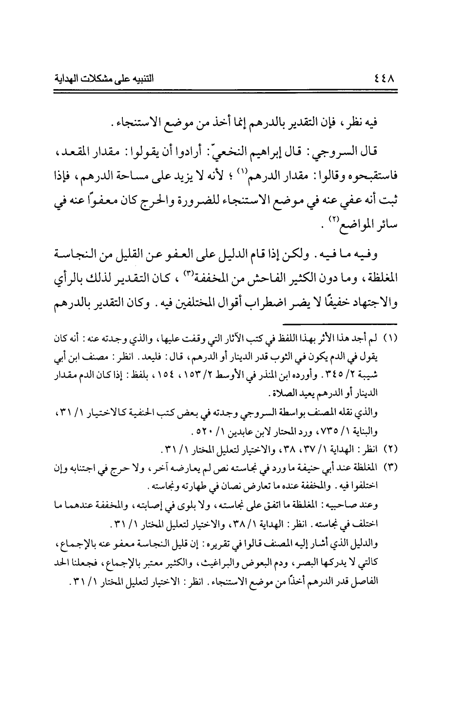 وفيه ما فيه. ولكن إذا قام الدليل على العفو عن القليل من النجاسة المغلظة، وما دون الكثير الفاحش من المخففة، كان التقدير لذلك بالرأي والاجتهاد خفيفًا لا يضر اضطراب أقوال المختلفين فيه. وكان التقدير بالدرهم