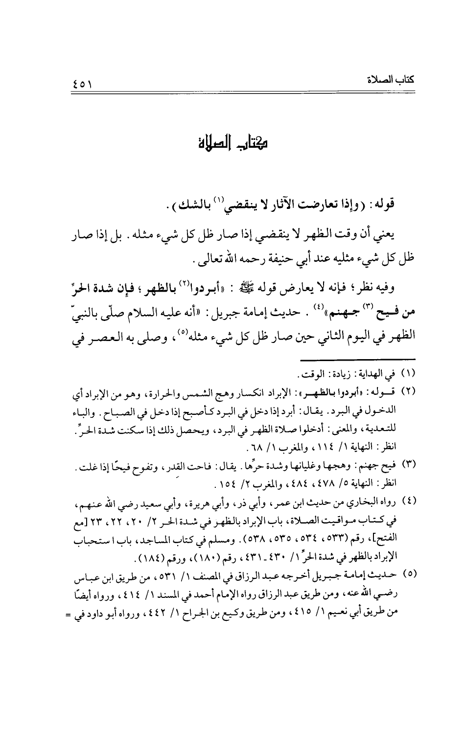 وفيه نظر؛ فإنه لا يعارض قوله -صلى الله عليه وسلم-: "أبردوا بالظهر؛ فإن شدة الحر من فيح جهنم". حديث إمامة جبريل: "أنه عليه السلام صلى بالنبي الظهر في اليوم الثاني حين صار ظل كل شيء مثله، وصلى به العصر في
