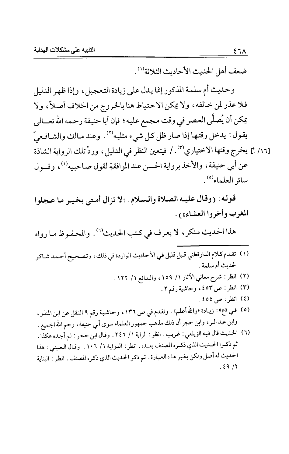 وحديث أم سلمة المذكور إنما يدل على زيادة التعجيل، وإذا ظهر الدليل فلا عذر لمن خالفه، ولا يمكن الاحتياط هنا بالخروج من الخلاف أصلًا، ولا يمكن أن يصلي العصر في وقت مجمع عليه؛ فإن أبا حنيفة رحمه الله تعالى يقول: يدخل وقتها إذا صار ظل كل شيء مثليه. وعند مالك والشافعي يخرج وقتها الاختياري./ فيتعين النظر في الدليل، ورد