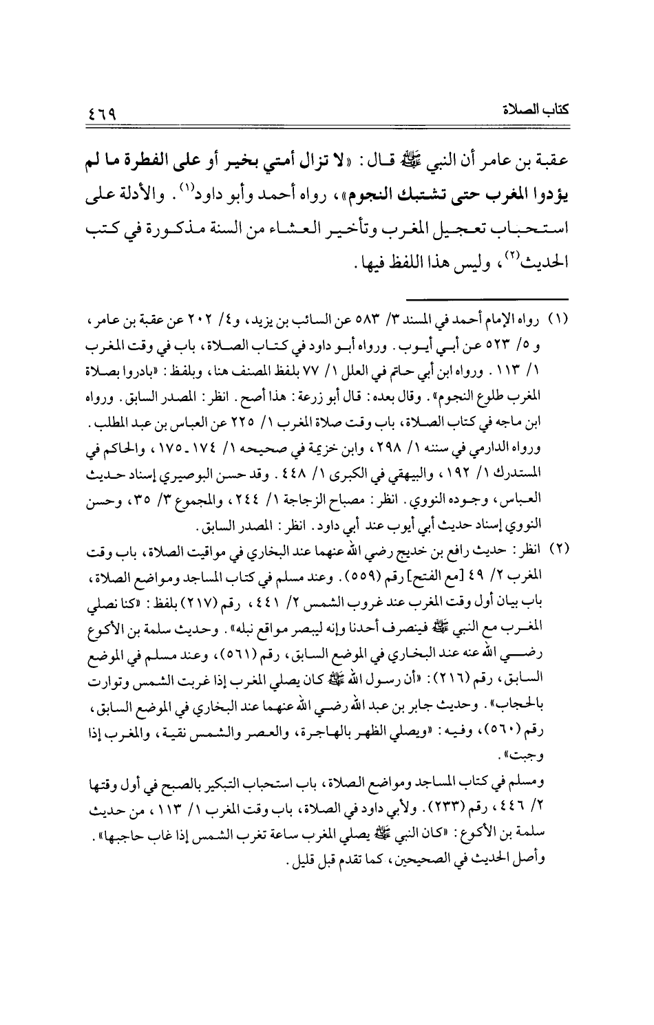 عقبة بن عامر أن النبي-صلى الله عليه وسلم- قال: "لا تزال أمتي بخير أو على الفطرة ما لم يؤدوا المغرب حتى تشتبك النجوم"، رواه أحمد وأبو داود. والأدلة على استحباب تعجيل المغرب وتأخير العشاء من السنة مذكورة في كتب الحديث، وليس هذا اللفظ فيها.