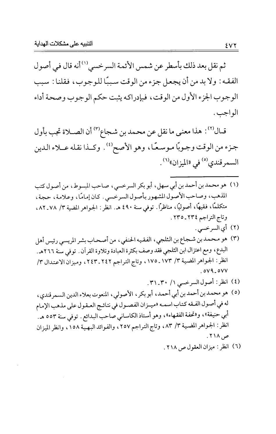 ثم نقل بعد ذلك بأسطر عن شمس الأئمة السرخسي أنه قال في أصول الفقه: ولا بد من أن يجعل جزء من الوقت سببًا للوجوب، فقلنا: سبب الوجوب الجزء الأول من الوقت، فبإدراكه يثبت حكم الوجوب وصحة أداء الواجب.