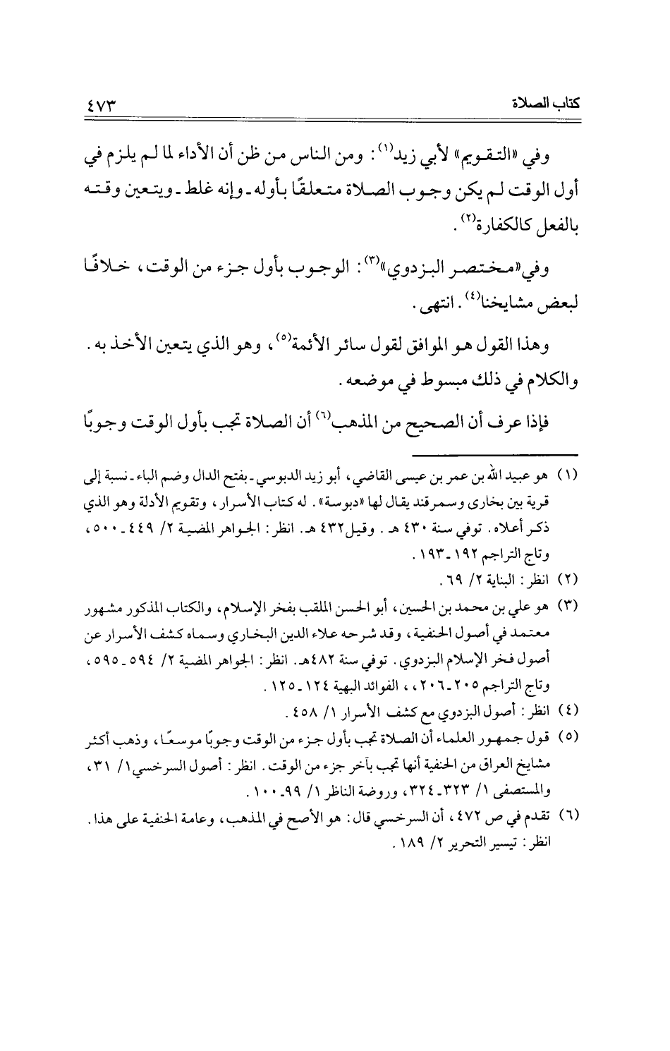 وفي "مختصر البزدوي": الوجوب بأول جزء من الوقت، خلافًا لبعض مشايخنا. انتهى.