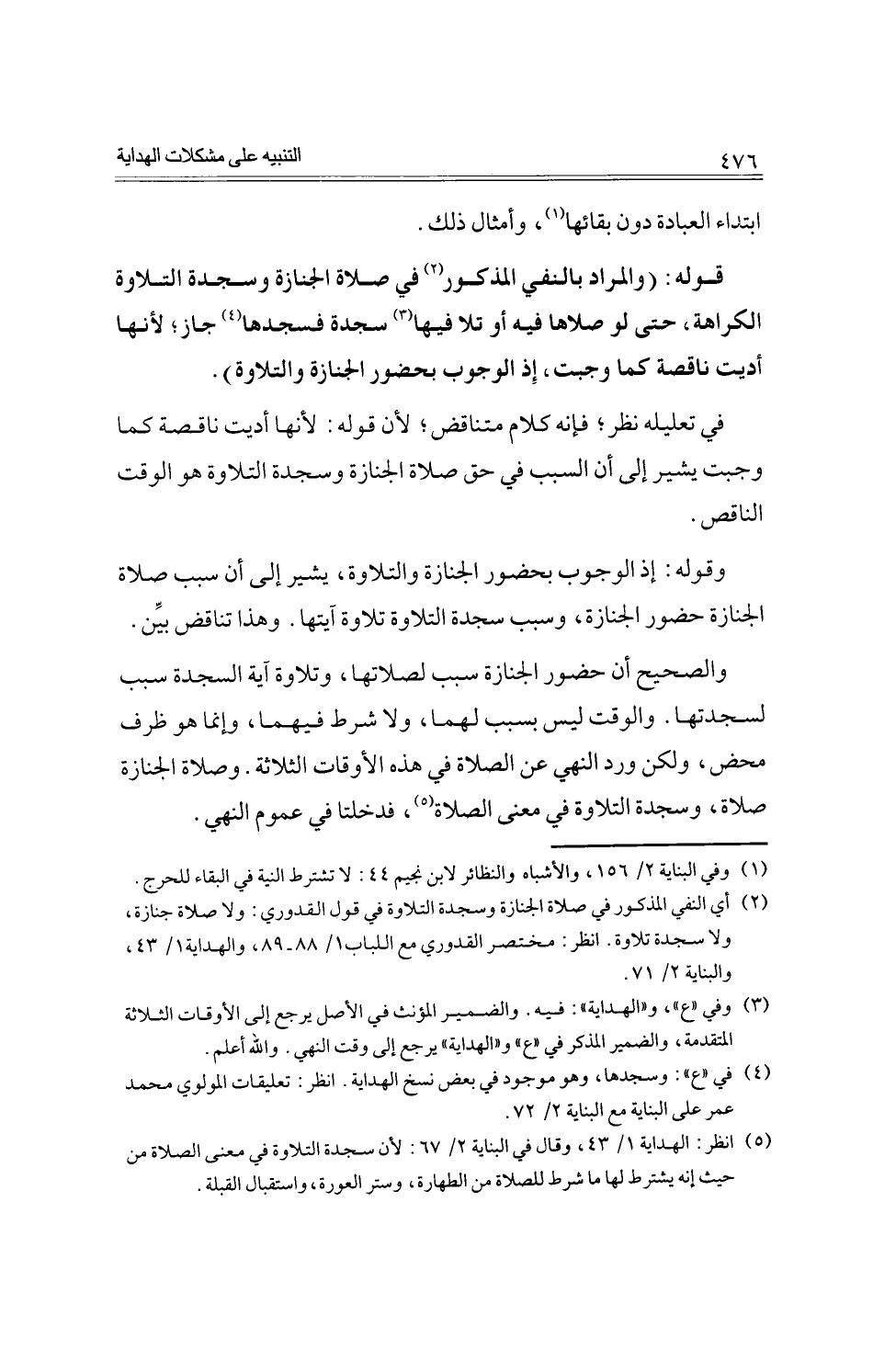 في تعليله نظر؛ فإنه كلام متناقض؛ لأن قوله: لأنها أديت ناقصة كما وجبت يشير إلى أن السبب في حق صلاة الجنازة وسجدة التلاوة هو الوقت الناقص.