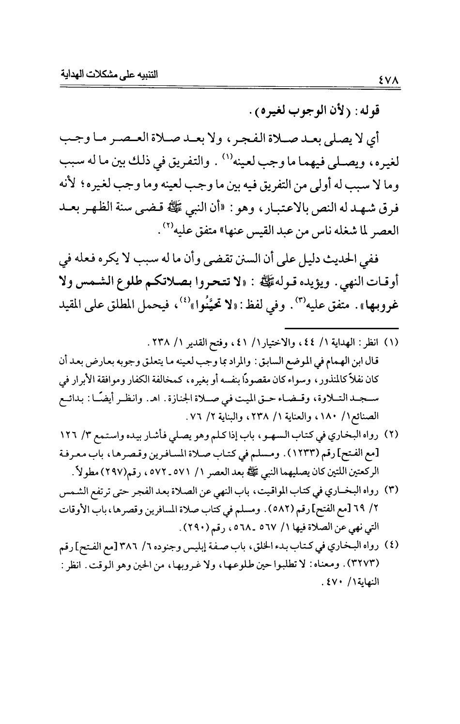 أي لا يصلى بعد صلاة الفجر، ولا بعد صلاة العصر ما وجب لغيره، ويصلى فيهما ما وجب لعينه. والتفريق في ذلك بين ما له سبب وما لا سبب له أولى من التفريق فيه بين ما وجب لعينه وما وجب لغيره؛ لأنه فرق شهد له النص بالاعتبار، وهو: "أن النبي-صلى الله عليه وسلم- قضى سنة الظهر بعد العصر لما شغله ناس من عبد القيس عنها" متفق عليه.