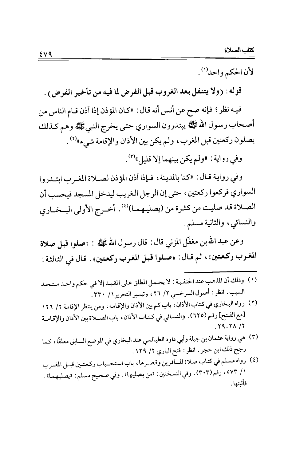 وفي رواية قال: "كنا بالمدينة، فإذا أذن المؤذن لصلاة المغرب ابتدروا السواري فركعوا ركعتين، حتى إن الرجل الغريب ليدخل المسجد فيحسب أن الصلاة قد صليت من كثرة من (يصليهما). أخرج الأولى البخاري والنسائي، والثانية مسلم.