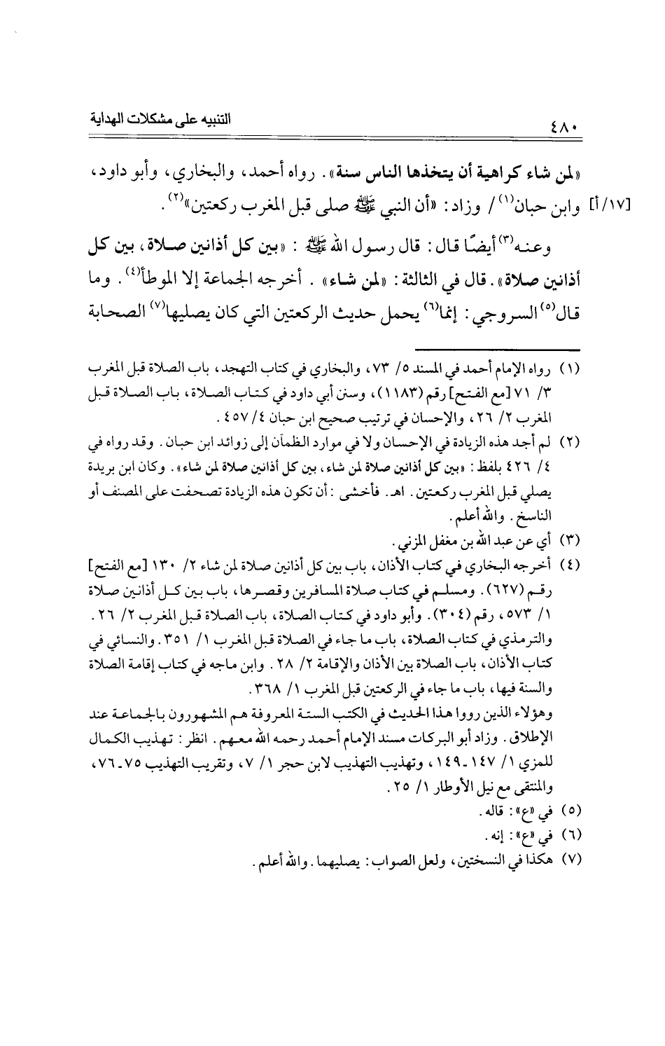 وعنه أيضًا قال: قال رسول الله -صلى الله عليه وسلم-: "بين كل أذانين صلاة، بين كل أذانين صلاة". قال في الثالثة: "لمن شاء". أخرجه الجماعة إلا الموطأ. وما قال السروجي: إنما يحمل حديث الركعتين التي كان يصليها الصحابة