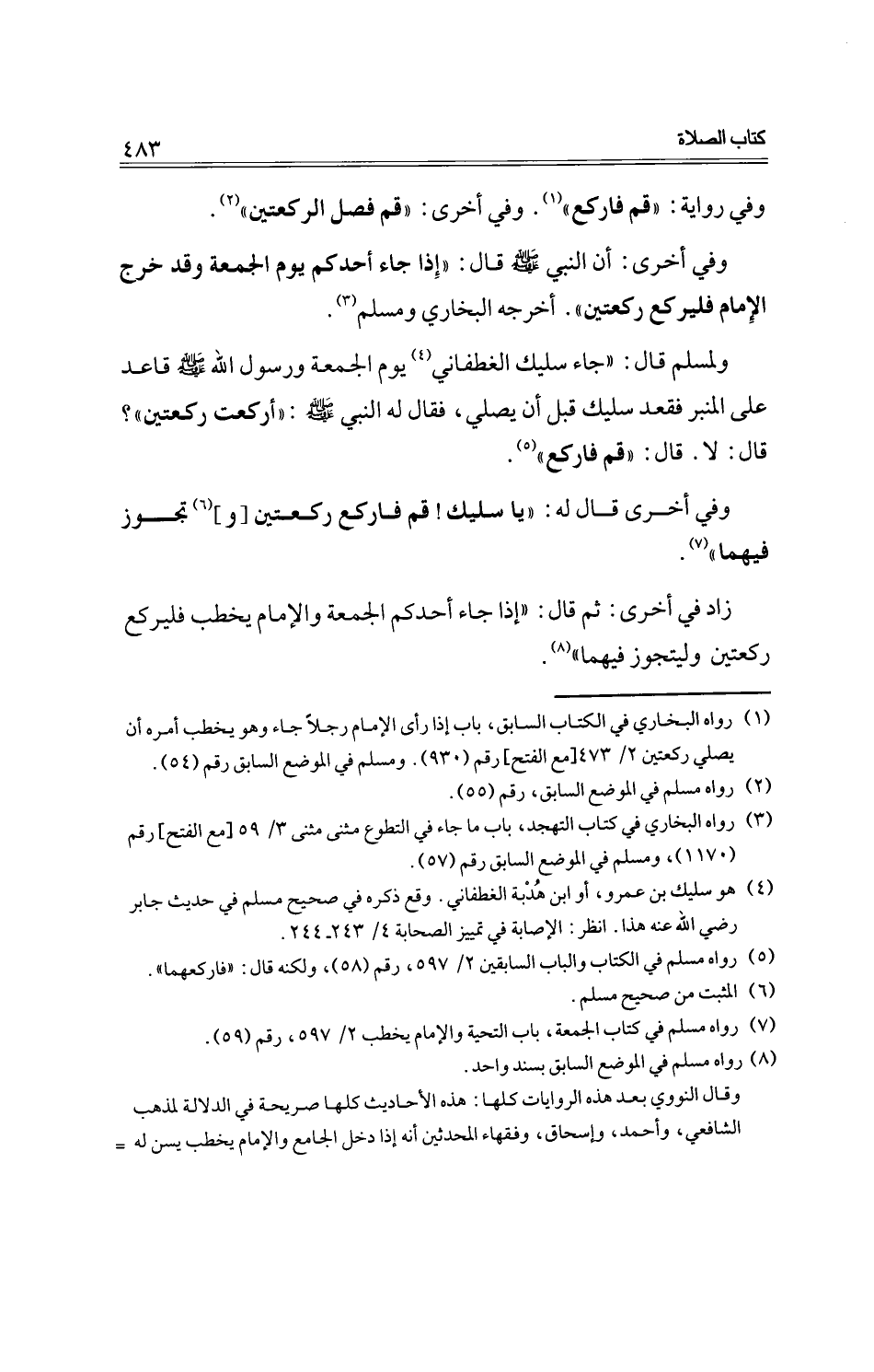 ولمسلم قال: "جاء سليك الغطفاني يوم الجمعة ورسول الله -صلى الله عليه وسلم- قاعد على المنبر فقعد سليك قبل أن يصلي، فقال له النبي -صلى الله عليه وسلم-: "أركعت ركعتين"؟ قال: لا. قال: "قم فاركع".