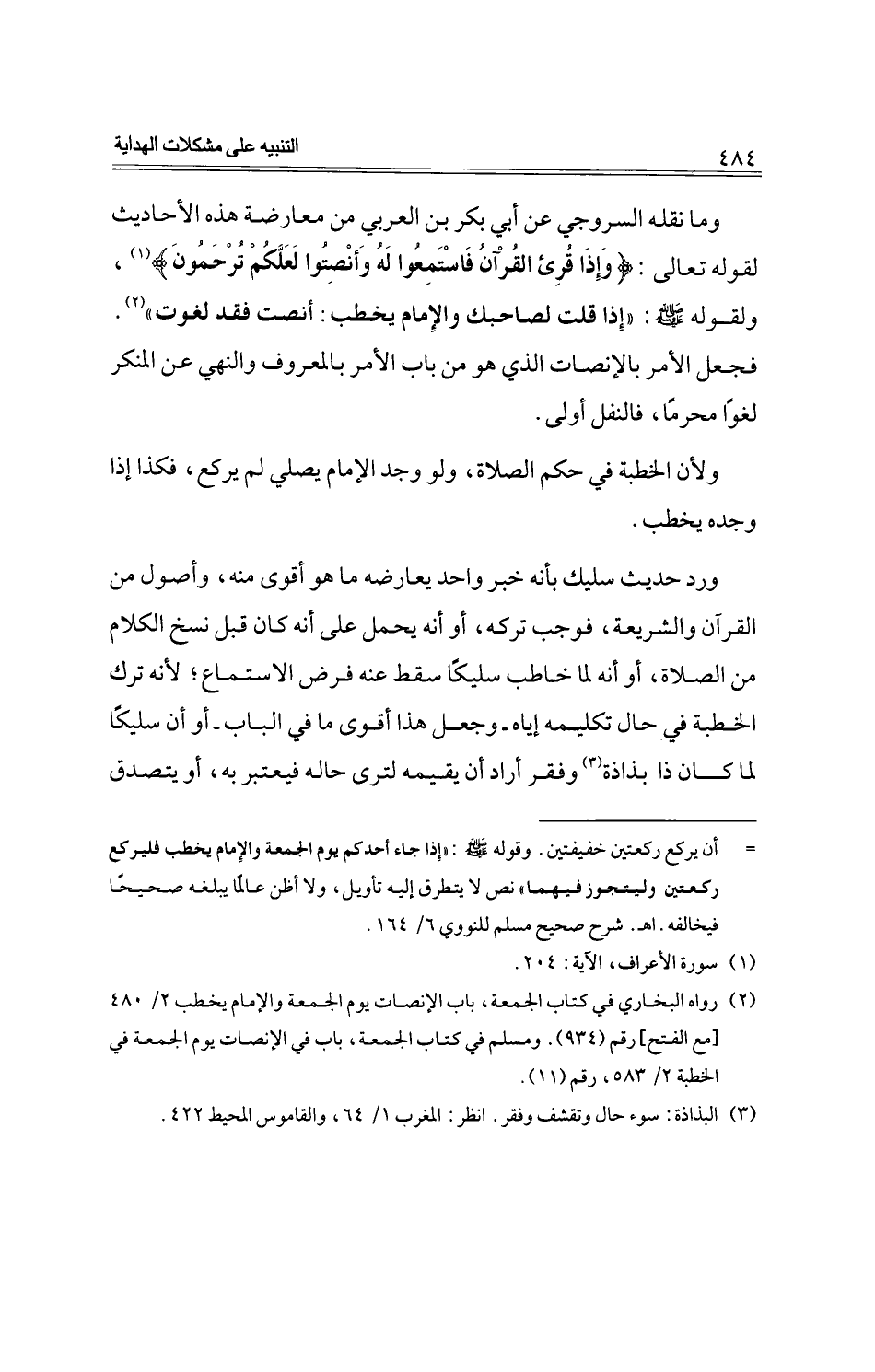 وما نقله السروجي عن أبي بكر بن العربي من معارضة هذه الأحاديث لقوله تعالى: {وإذا قرئ القرآن فاستمعوا له وأنصتوا لعلكم ترحمون}، ولقوله -صلى الله عليه وسلم-: "إذا قلت لصاحبك والإمام يخطب: أنصت فقد لغوت".