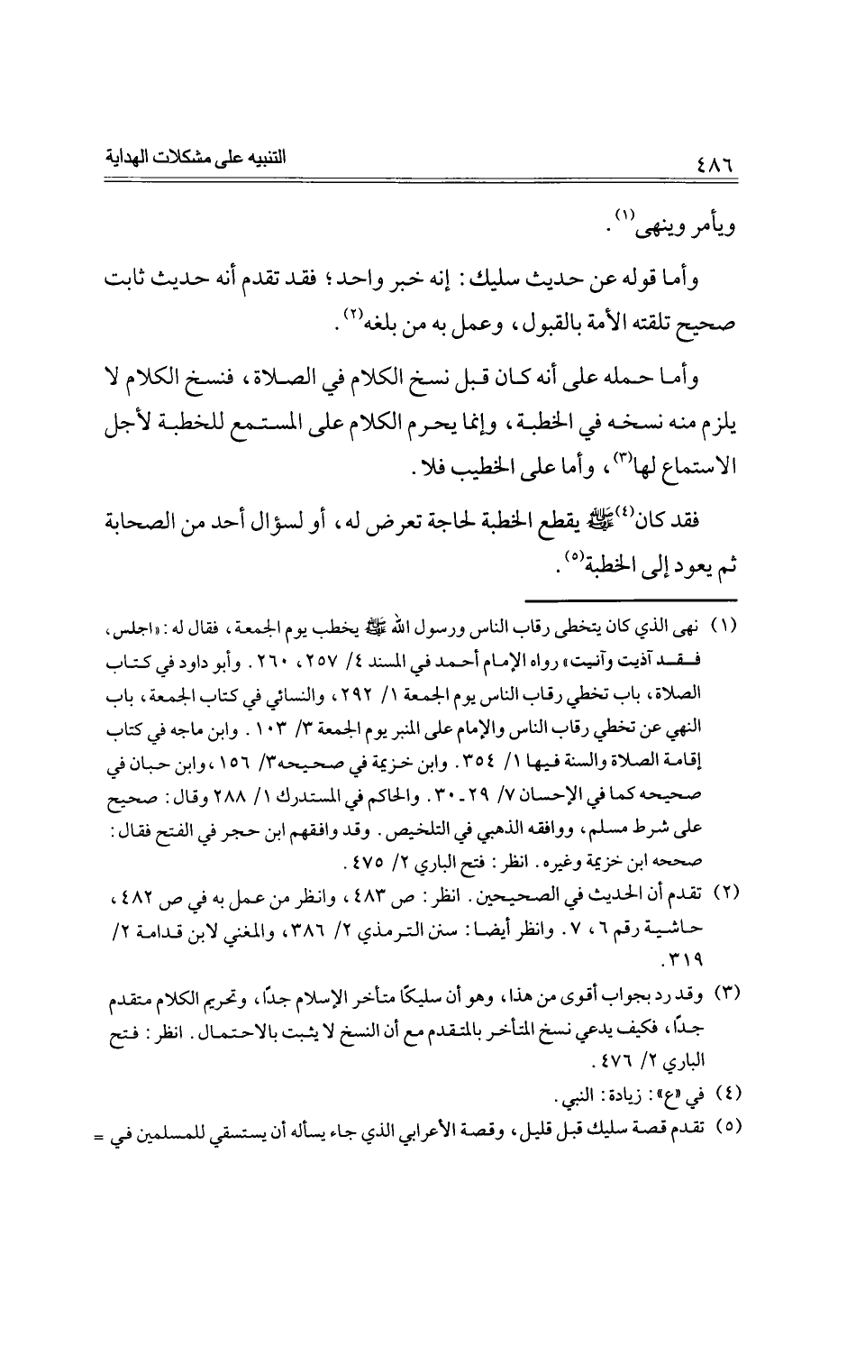 وأما حمله على أنه كان قبل نسخ الكلام في الصلاة، فنسخ الكلام لا يلزم منه نسخه في الخطبة، وإنما يحرم الكلام على المستمع للخطبة لأجل الاستماع لها، وأما على الخطيب فلا.