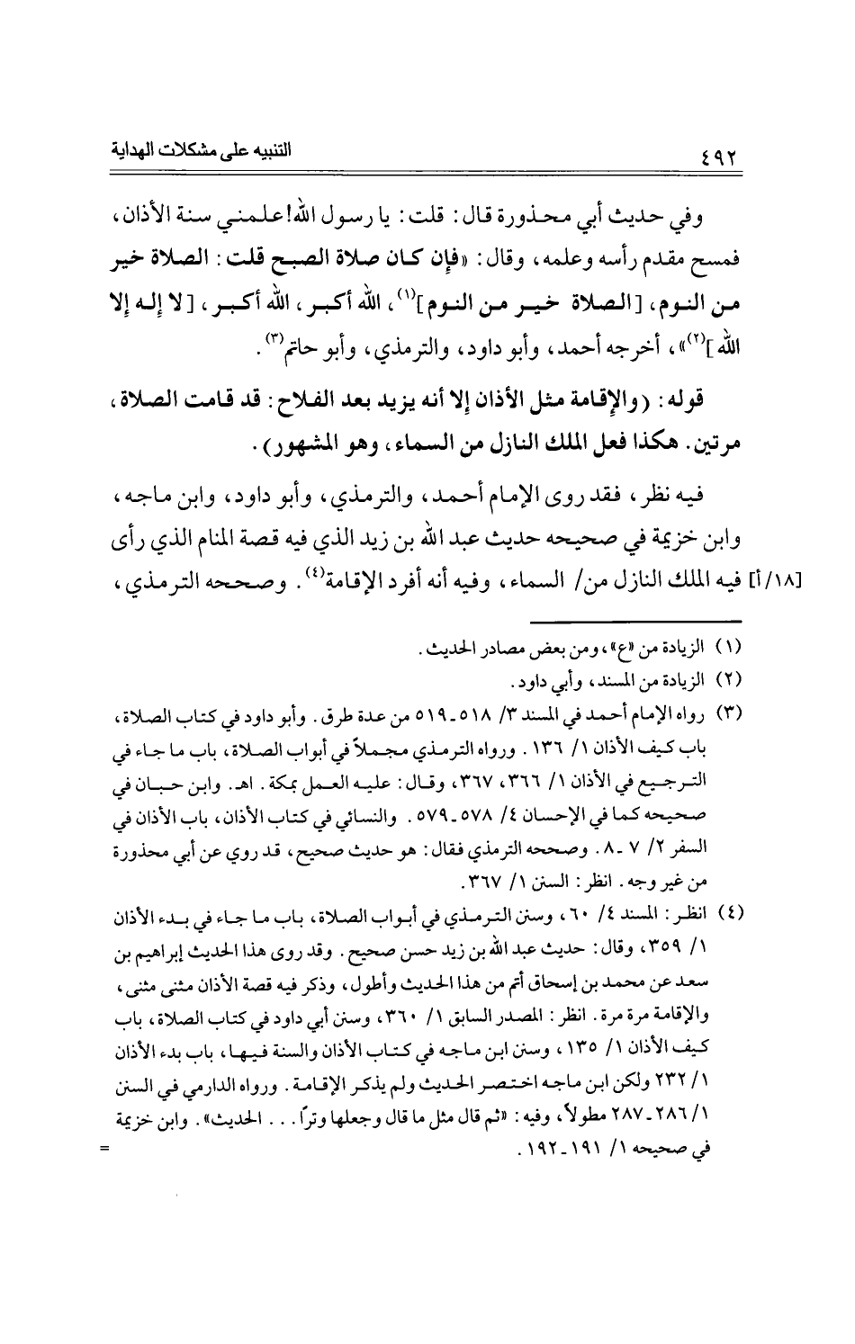 وفي حديث أبي محذورة قال: قلت يا رسول الله! علمني سنة الأذان، فمسح مقدم رأسه وعلمه، وقال: "فإن كان صلاة الصبح قلت: الصلاة خير من النوم، [الصلاة خير من النوم]، الله أكبر، الله أكبر، [لا إله إلا الله] "، أخرجه أحمد، وأبو داود، والترمذي، وأبو حاتم.