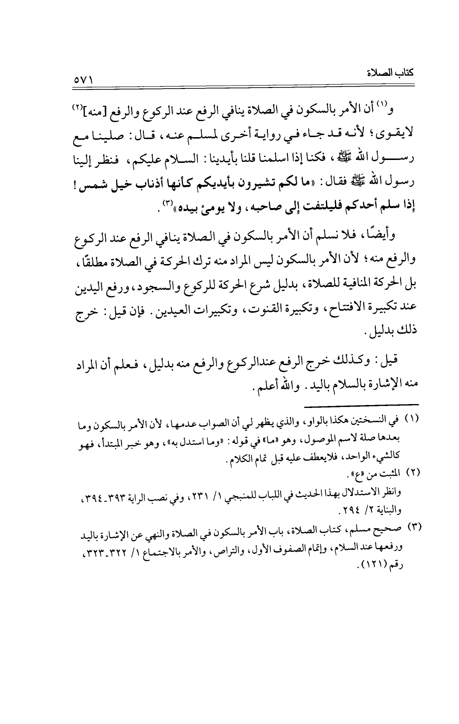 وأن الأمر بالسكون في الصلاة ينافي الرفع عند الركوع والرفع [منه] لا يقوى؛ لأنه قد جاء في رواية أخرى لمسلم عنه، قال: صلينا مع رسول الله -صلى الله عليه وسلم-، فكنا إذا أسلمنا قلنا بأيدينا: السلام عليكم، فنظر إلينا رسول الله -صلى الله عليه وسلم- فقال: "ما لكم تشيرون بأيديكم كأنها أذناب خيل شمس! إذا سلم أحدكم فليلتفت إلى صاحبه، ولا يومئ بيده".