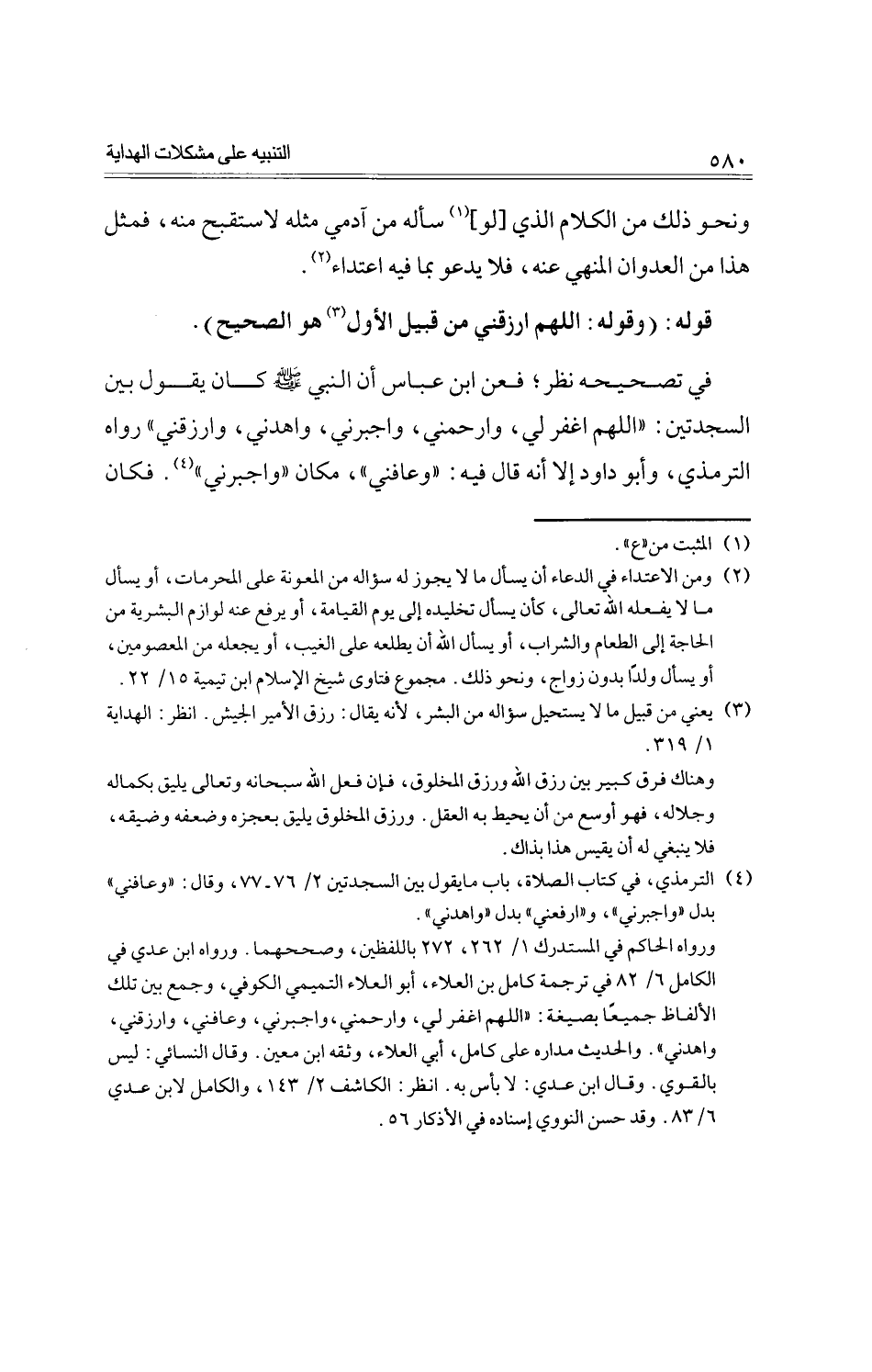في تصحيحه نظر؛ فعن ابن عباس أن النبي -صلى الله عليه وسلم- كان يقول بين السجدتين: "اللهم اغفر لي، وارحمني، واجبرني، واهدني، وارزقني" رواه الترمذي، وأبو داود إلا أنه قال فيه: "وعافني"، مكان "واجبرني". فكان
