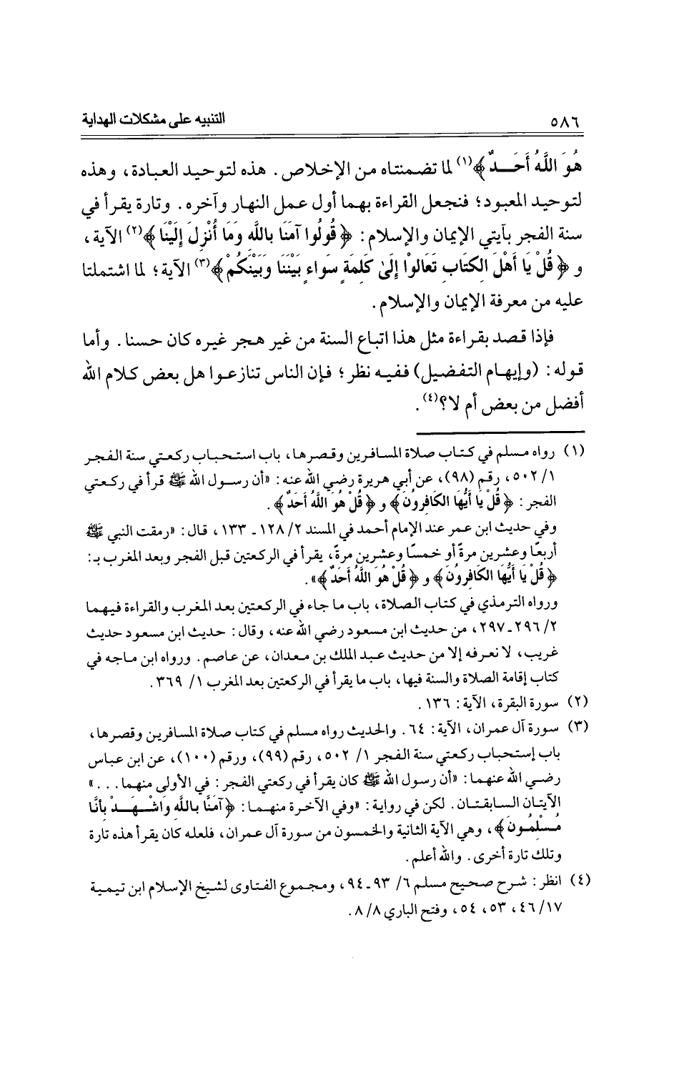 هو الله أحد} لما تضمناه من الإخلاص. هذه لتوحيد العبادة، وهذه لتوحيد المعبود؛ فنجعل القراءة بهما أول عمل النهار وآخره. وتارة يقرأ في سنة الفجر بآيتي الإيمان والإسلام: {قولوا آمنا بالله وما أنزل إلينا} الآية، و {قل يا أهل الكتاب تعالوا إلى كلمة سواء بيننا وبينكم} الآية؛ لما اشتملتا عليه من معرفة الإيمان والإسلام.