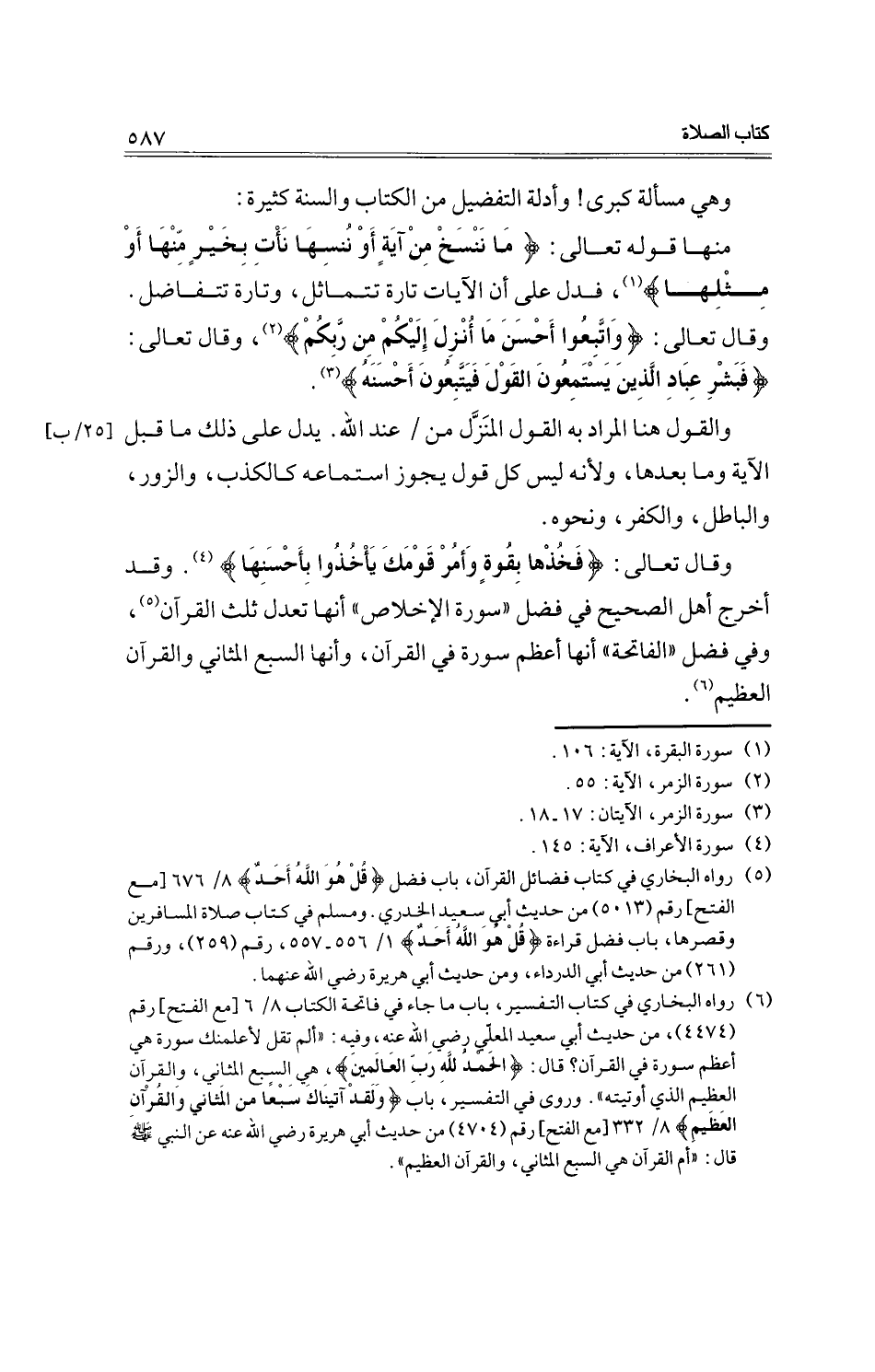 وقال تعالى: {فخذها بقوة وأمر قومك يأخذوا بأحسنها}. وقد أخرج أهل الصحيح في فضل "سورة الإخلاص" أنها تعدل ثلث القرآن، وفي فضل "الفاتحة" أنها أعظم سورة في القرآن، وأنها السبع المثاني والقرآن العظيم.