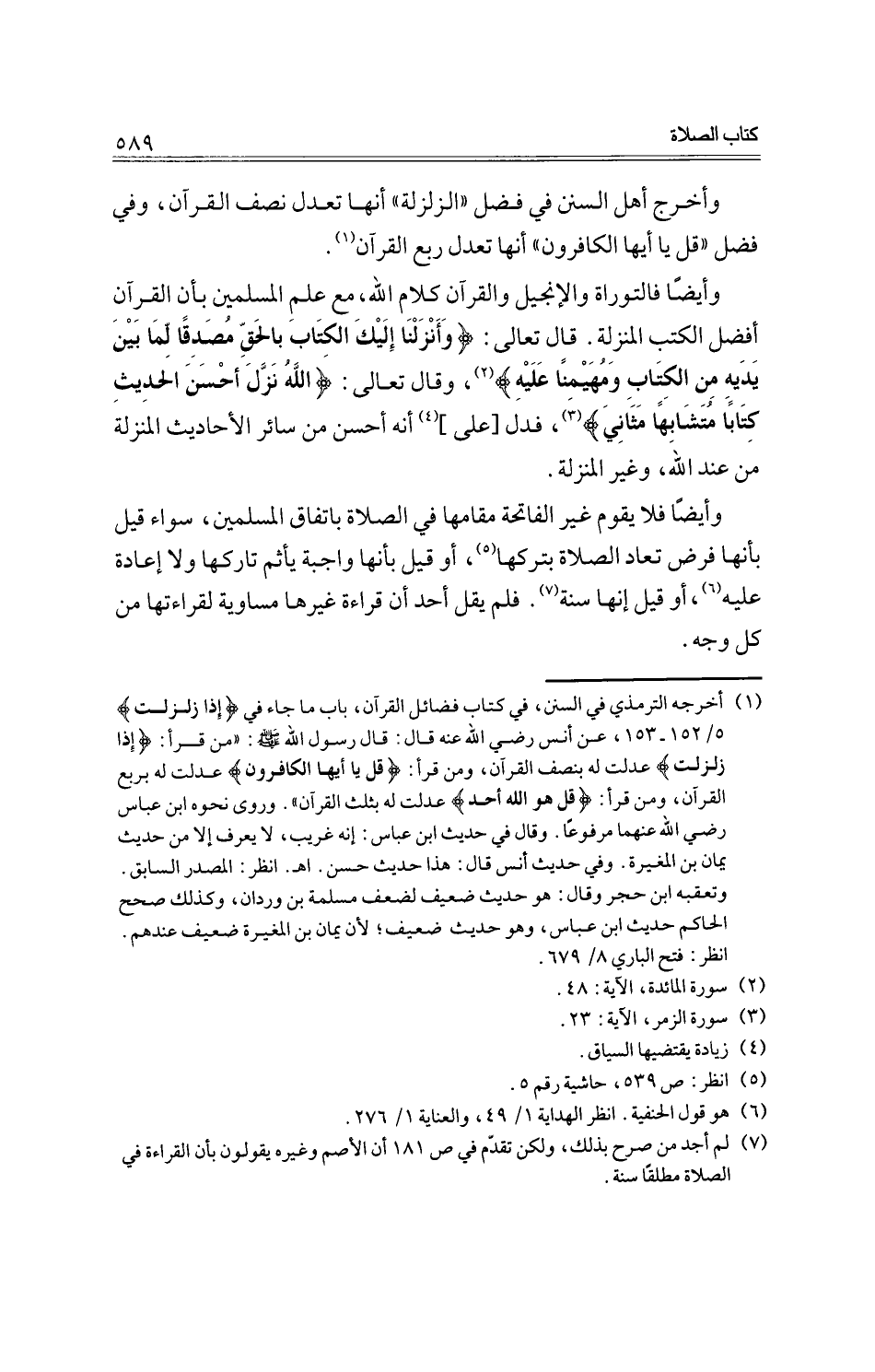 وأخرج أهل السنن في فضل "الزلزلة" أنها تعدل نصف القرآن، وفي فضل "قل يا أيها الكافرون" أنها تعدل ربع القرآن.