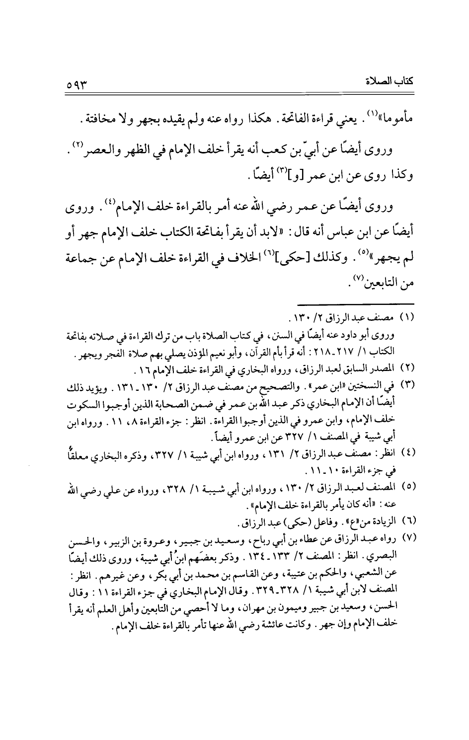 وروى أيضًا عن عمر رضي الله عنه أمر بالقراءة خلف الإمام. ورورى أيضًا عن ابن عباس أنه قال: "لابد أن يقرأ بفاتحة الكتاب خلف الإمام جهر أو لم يجهر". وكذلك [حكى] الخلاف في القراءة خلف الإمام عن جماعة من التابعين.