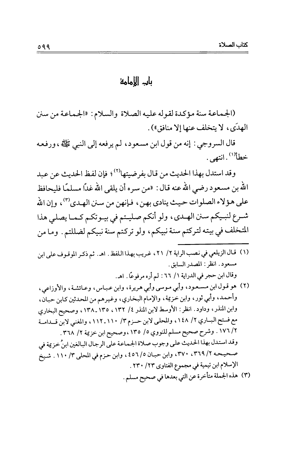 (الجماعة سنة مؤكدة لقوله عليه الصلاة والسلام: "الجماعة من سنن الهدى، لا يتخلف عنها الإ منافق").