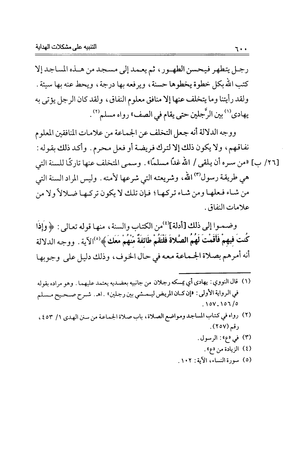 ووجه الدلالة أنه جعل التخلف عن الجماعة من علامات المنافقين المعلوم نفاقهم، ولا يكون ذلك إلا لترك فريضة أو فعل محرم، وأكد ذلك بقوله: "من سره أن يلقى الله غدًا مسلمًا". وسمى المتخلف عنها تاركًا للسنة التي هي طريقة رسول الله، وشريعته التي شرعها لأمته، وليس المراد السنة التي من شاء فعلها ومن شاء تركها؛ فإن تلك لا يكون تركها ضلالًا ولا من علامات النفاق