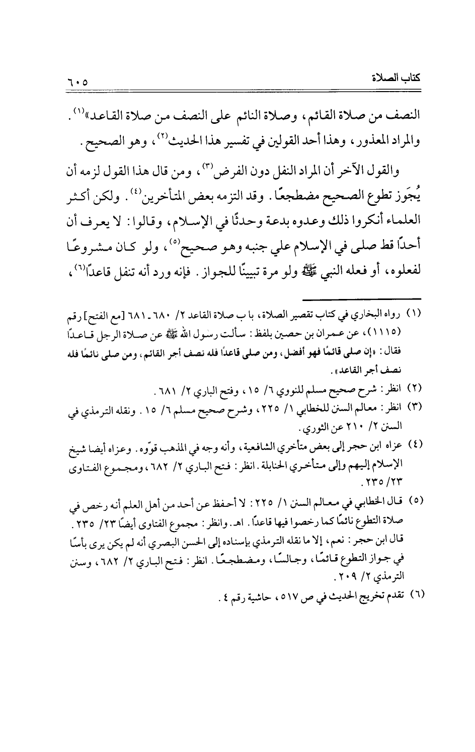 والقول الآخر أن المراد النفل دون الفرض، ومن قال هذا القول لزمه أن يجوز تطوع الصحيح مضطجعًا. وقد التزمه بعض المتأخرين. ولكن أكثر العلماء أنكروا ذلك وعدوه بدعة وحدثًا في الإسلام، وقالوا: لا يعرف أن أحدًا قط صلى في الإسلام على جنبه وهو صحيح، ولو كان مشروعًا لفعلوه، أو فعله النبي -صلى الله عليه وسلم- ولو مرة تبينًا للجواز. فإنه ورد أنه تنفل قاعدًا،