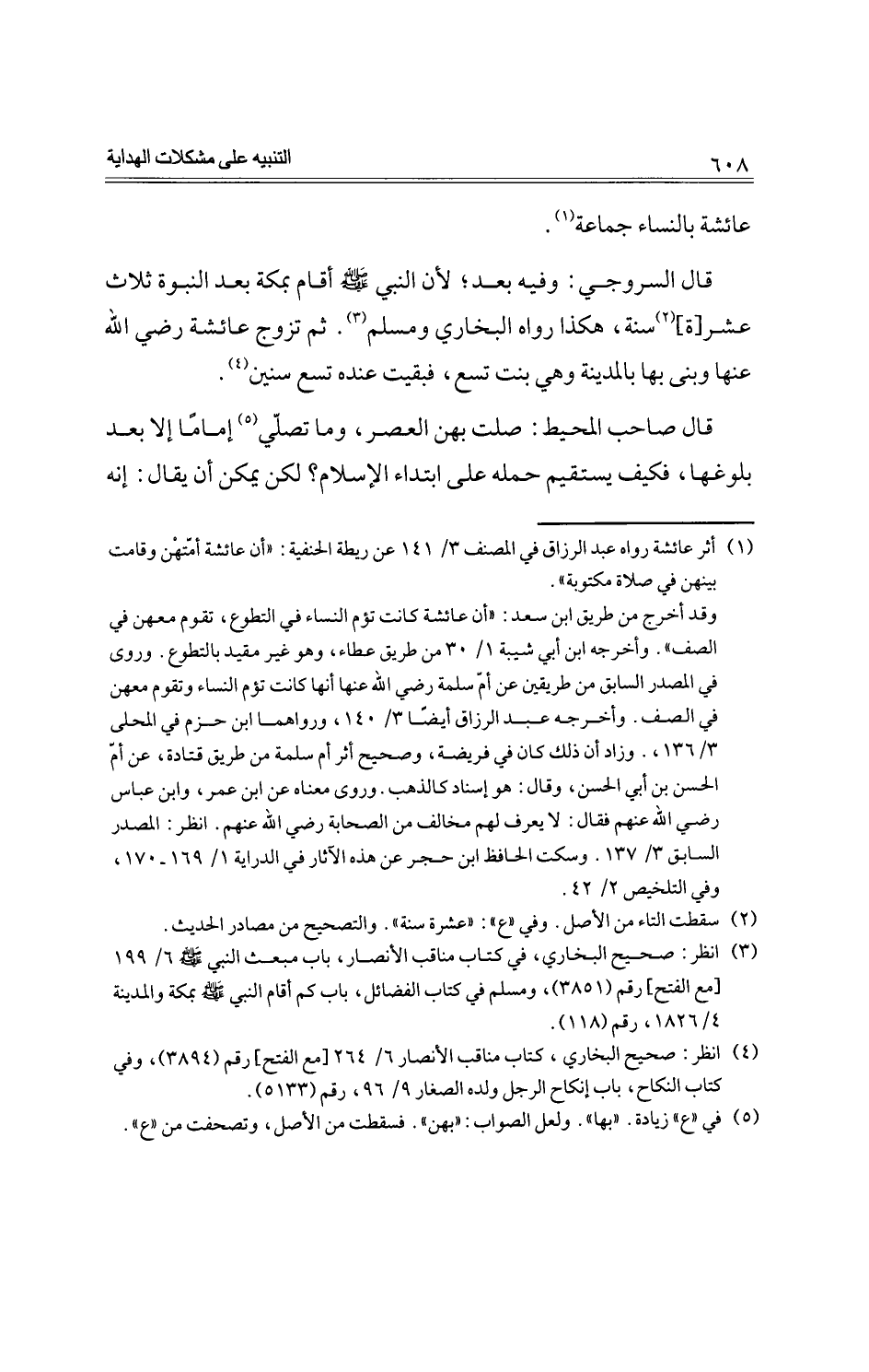 قال السروجي: وفيه بعد؛ لأن النبي -صلى الله عليه وسلم- أقام بمكة بعد النبوة ثلاث عشر [ة] سنة، هكذا رواه البخاري ومسلم. ثم تزوج عائشة رضي الله عنها وبني بها بالمدينة وهي بنت تسع، فبقيت عنده تسع سنين.