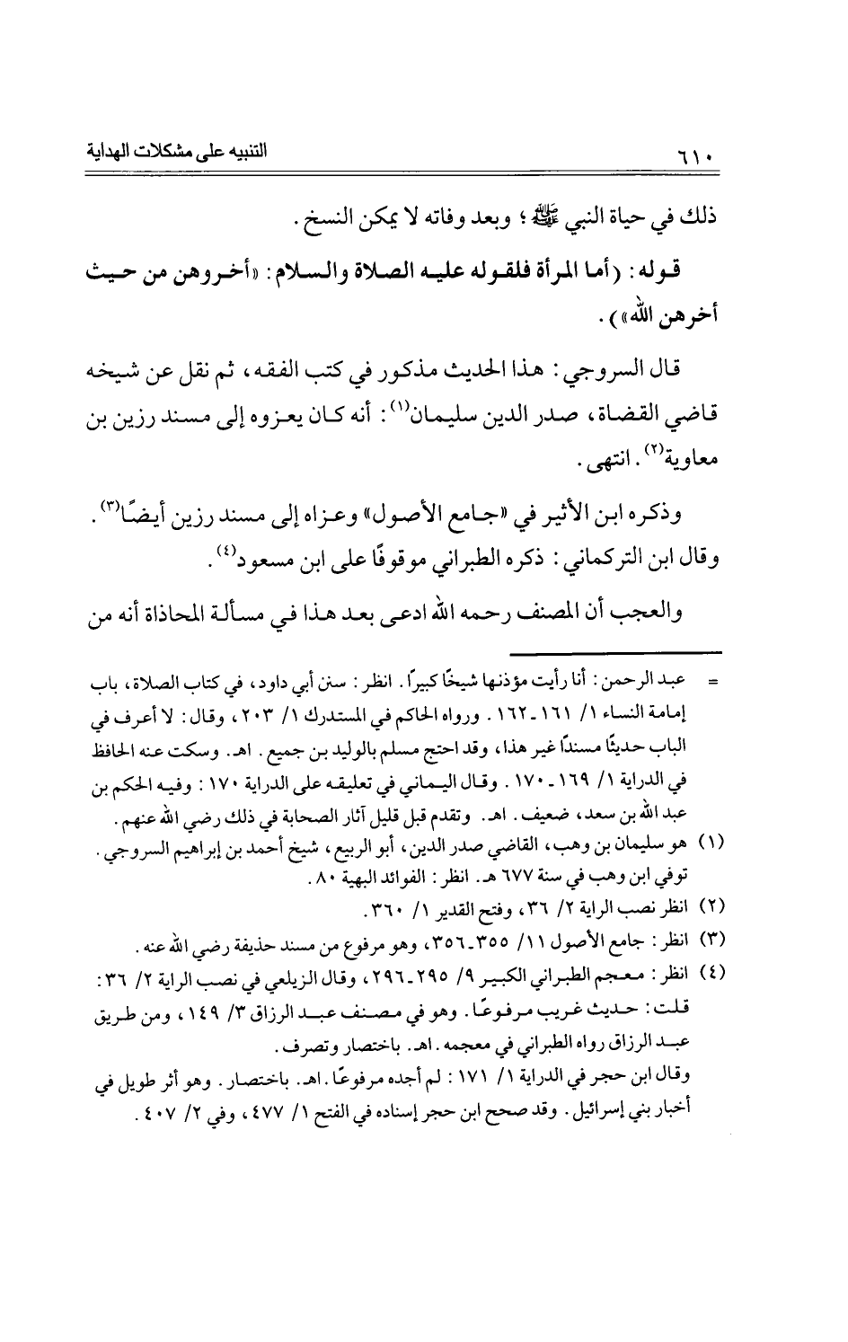 قال السروجي: هذا الحديث مذكور في كتب الفقه، ثم نقل عن شيخه قاضي القضاة، صدر الدين سليمان: أنه كان يعزوه إلى مسند رزين بن معاوية. انتهى.