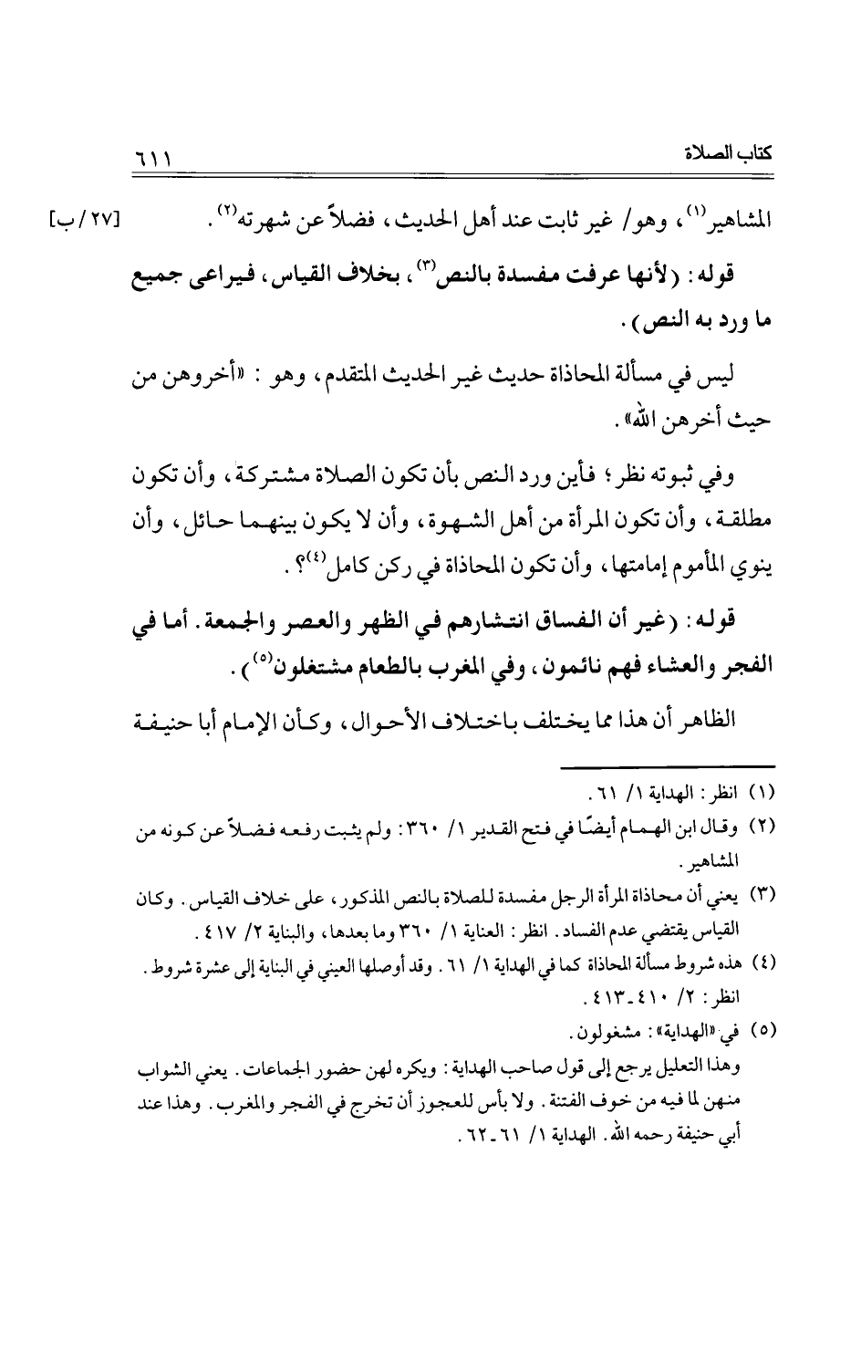 وفي ثبوته نظر؛ فأين ورد النص بأن تكون الصلاة مشتركة، وأن تكون مطلقة، وأن تكون المرأة من أهل الشهوة، وأن لا يكون بينهما حائل، وأن ينوي المأموم إمامتها، وأن تكون المحاذاة في ركن كامل؟