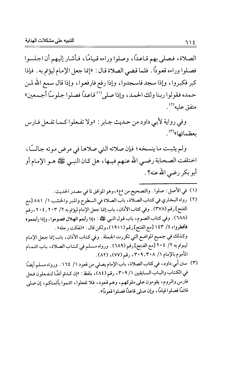 ولم يثبت ما ينسخه؛ فإن صلاته التي صلاها في مرض موته جالسًا، اختلفت الصحابة رضي الله عنهم فيها، هل كان النبي -صلى الله عليه وسلم- هو الإمام أو أبو بكر رضي الله عنه؟.