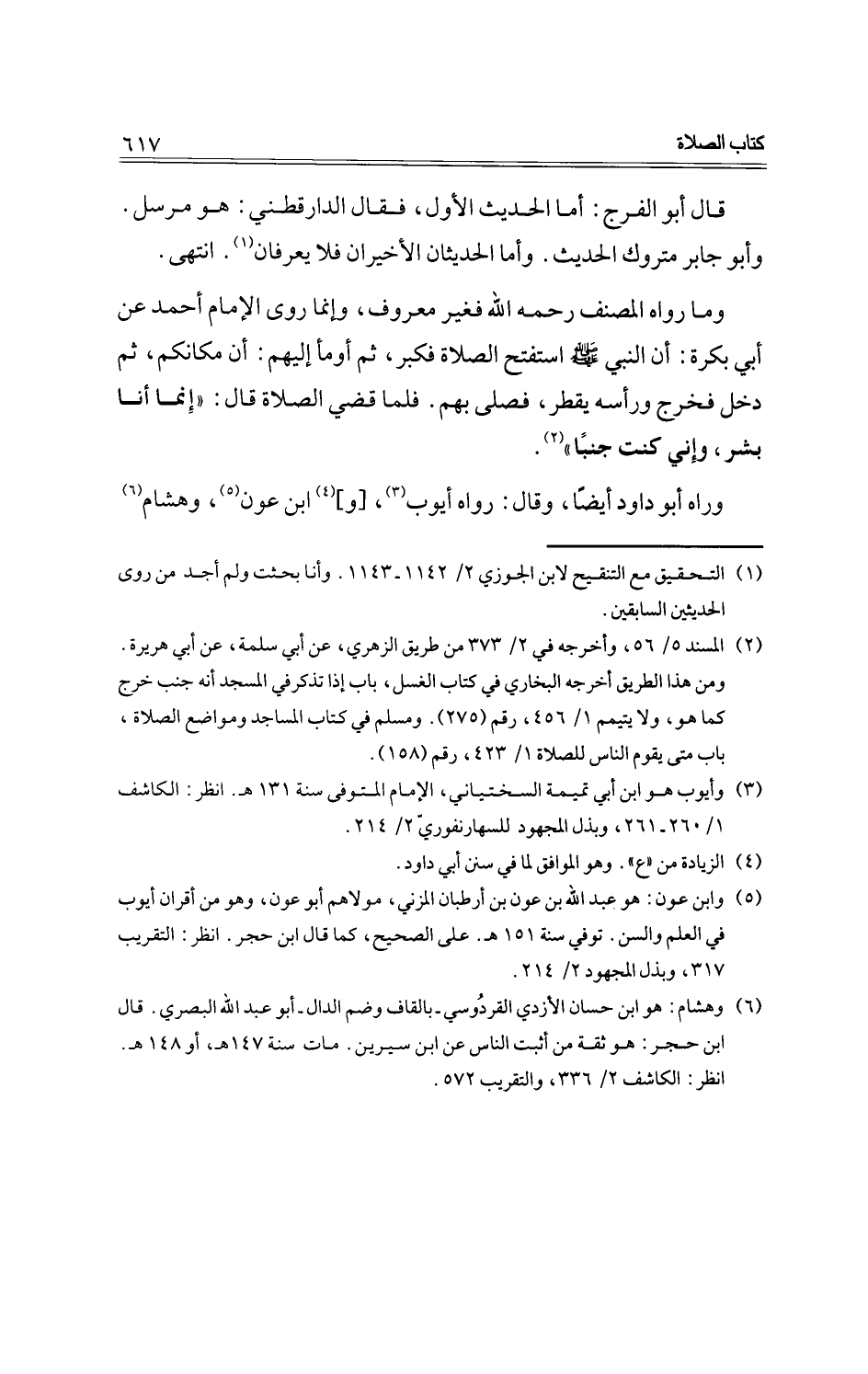 وما رواه المصنف رحمه الله فغير معروف، وإنما روى الإمام أحمد عن أبي بكرة: أن النبي -صلى الله عليه وسلم- استفتح الصلاة فكبر، ثم أومأ إليهم: أن مكانكم، ثم دخل فخرج ورأسه يقطر، فصلى بهم. فلما قضي الصلاة قال: "إنما أنا بشر، وإني كنت جنبًا".