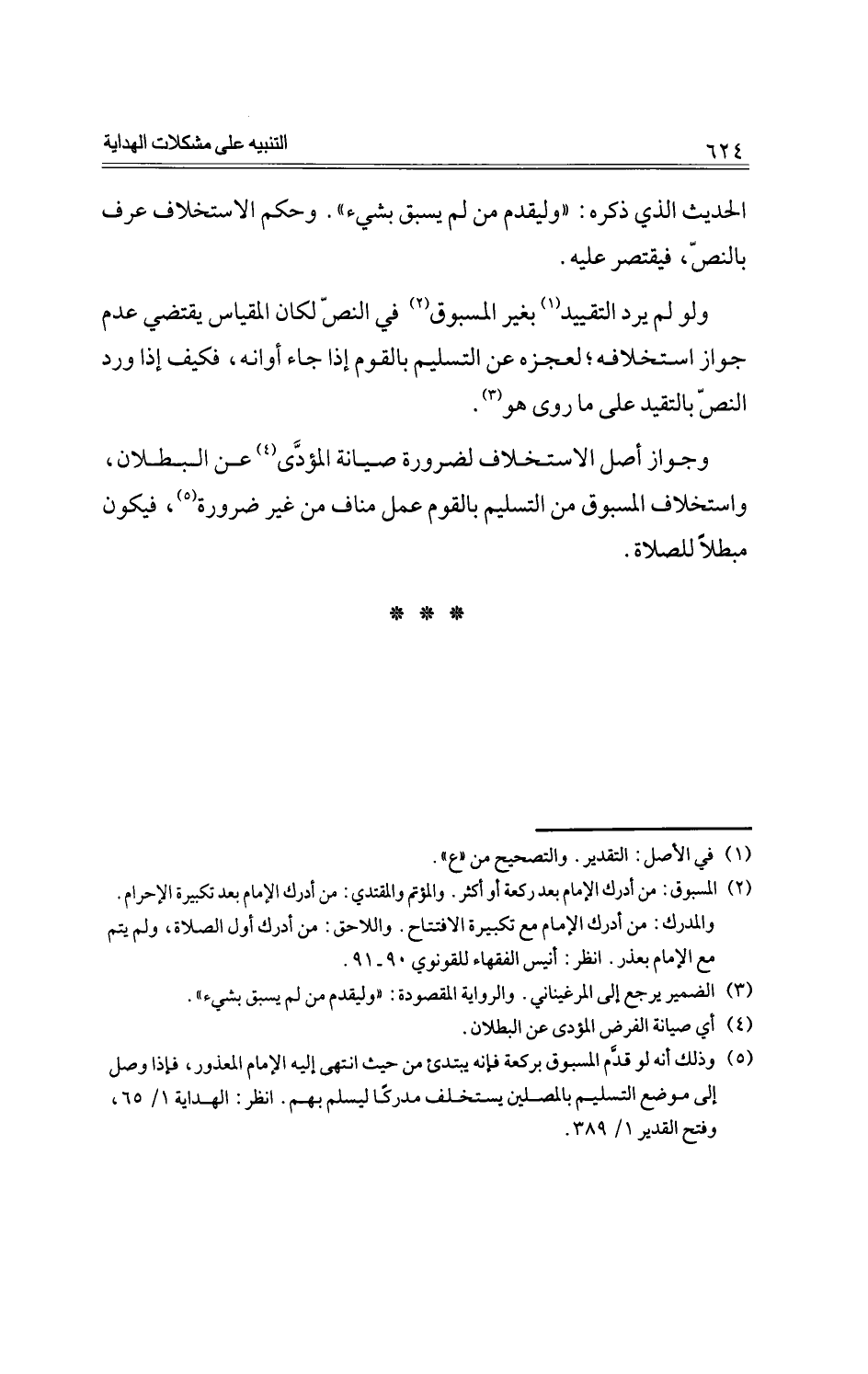 وجواز أصل الاستخلاف لضرورة صيانة المؤدى عن البطلان، واستخلاف المسبوق من التسليم بالقوم عمل مناف من غير ضرورة، فيكون مبطلًا للصلاة.