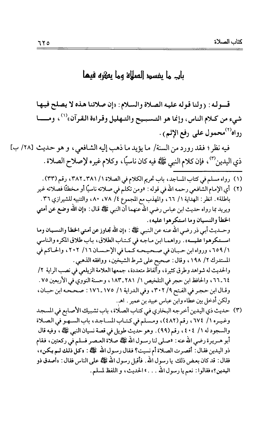 فيه نظر؛ فقد ورد من السنة ما يؤيد ما ذهب إليه الشافعي، وهو حديث ذي اليدين، فإن كلام النبي -صلى الله عليه وسلم- فيه كان ناسيًا، وكلام غيره لإصلاح الصلاة.