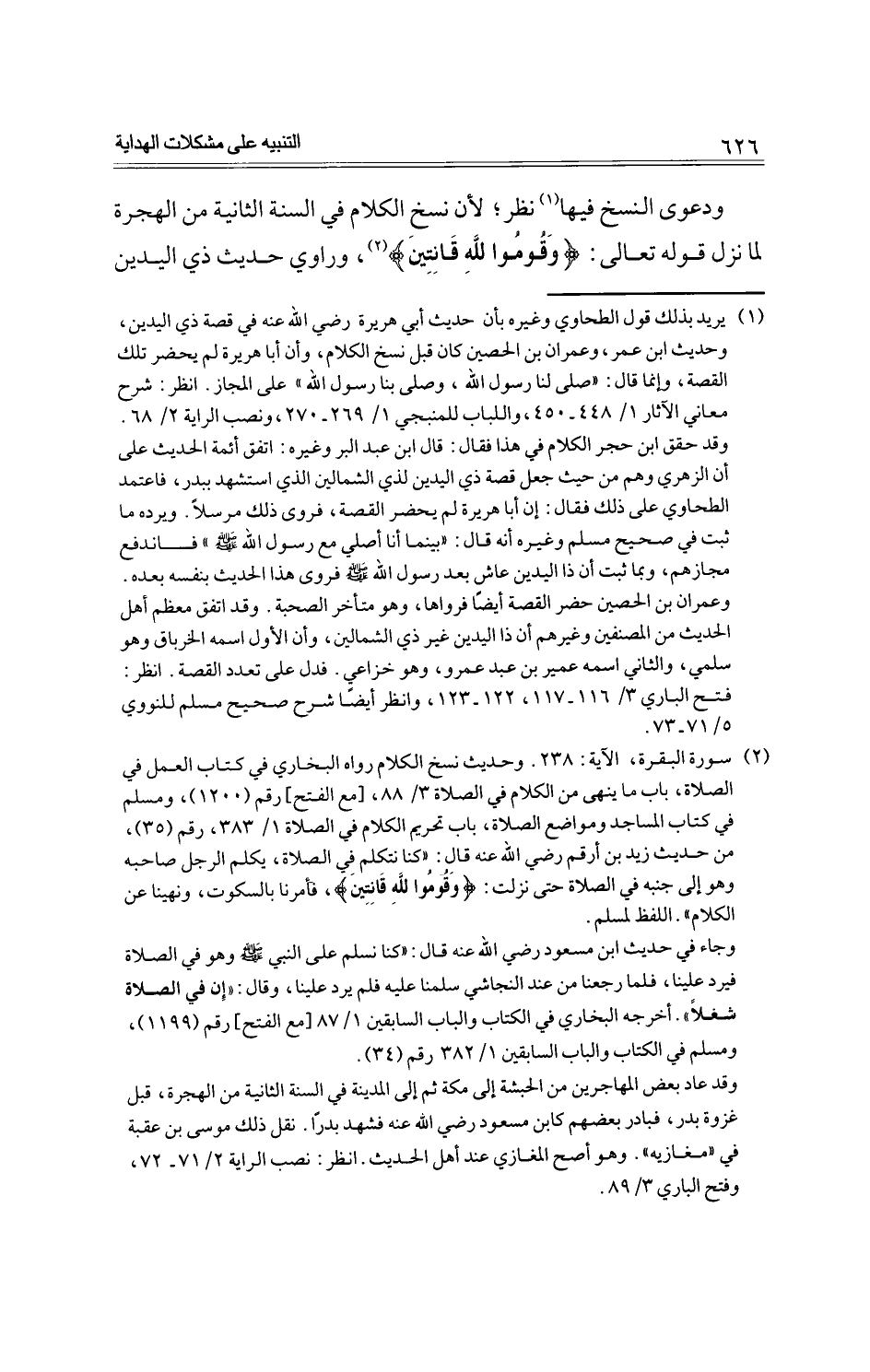 ودعوى النسخ فيها نظر؛ لأن نسخ الكلام في السنة الثانية من الهجرة لما نزل قوله تعالى: {وقوموا لله قانتين}، وراوي حديث ذي اليدين